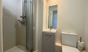Comprising a square shower enclosure with thermostatic shower, WC, wash basin with storage below, wall tiling within the shower enclosure, radiator, extractor fan and laminate wood flooring.