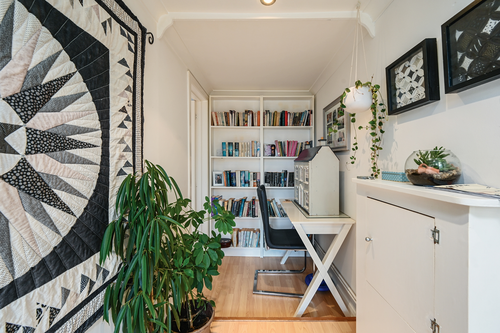 This room is currently arranged as a study and reading area, with fitted shelving providing full-height storage for books. A space for a desk is positioned to one side, making it suitable for use as a home office or hobby space. The room has a laminate floor, neutral décor, and a window that brings in natural light.