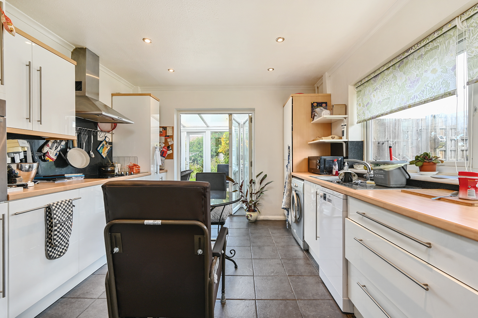 The kitchen is fitted with a range of white gloss units and contrasting wood-effect worktops, incorporating an inset sink beneath a wide window overlooking the garden. Integrated appliances include a gas hob with extractor hood above, alongside space and plumbing for further white goods. The room is laid with tiled flooring and has ceiling spotlights for even lighting. There is space for a small dining table and chairs, with double doors opening directly to the conservatory and garden beyond.