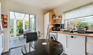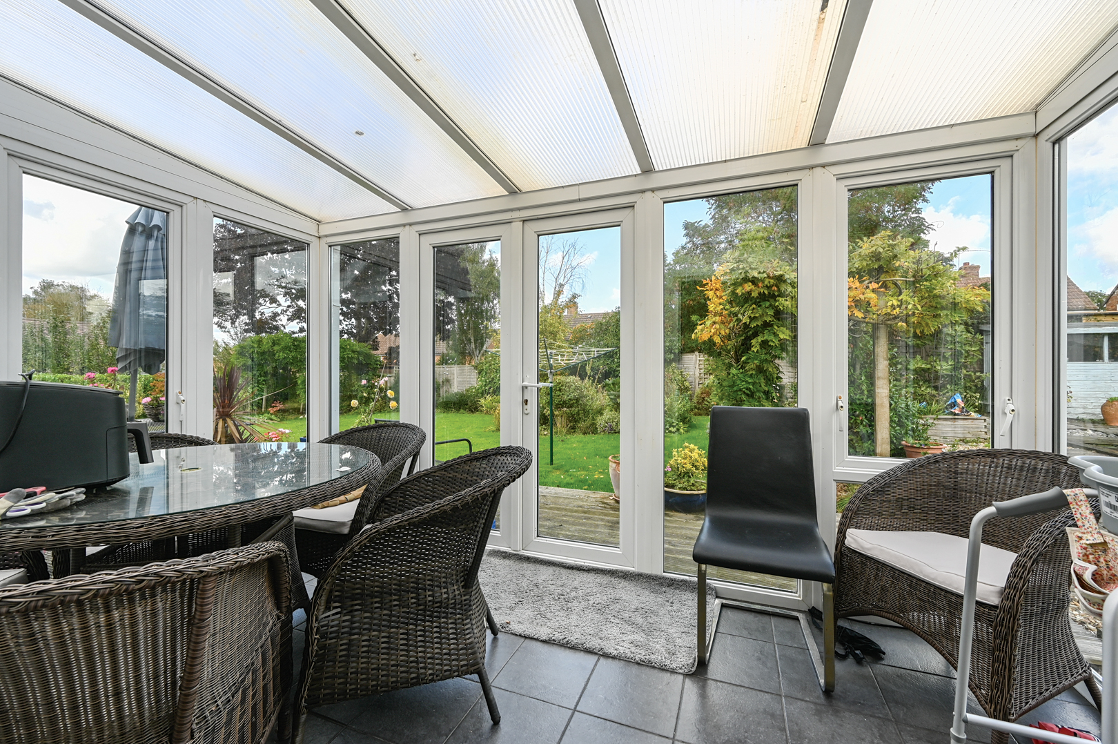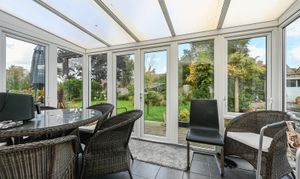 The conservatory is set to the rear of the property and provides direct access to the garden through double doors. Surrounded by full-height glazing, it enjoys views across the garden and allows for plenty of natural light. The room is finished with tiled flooring, making it practical as an additional sitting or dining area.