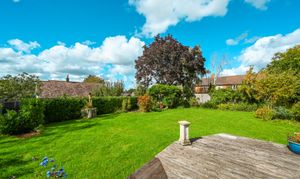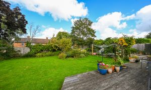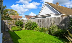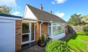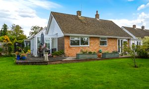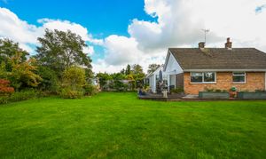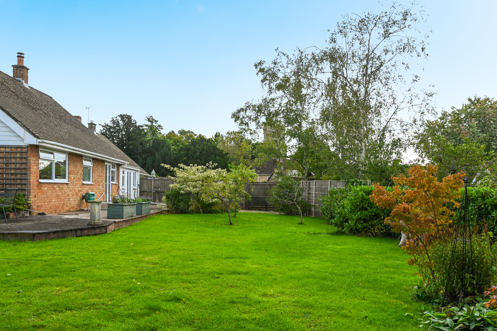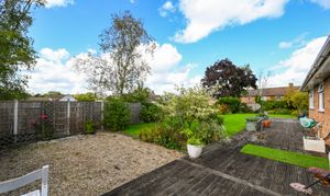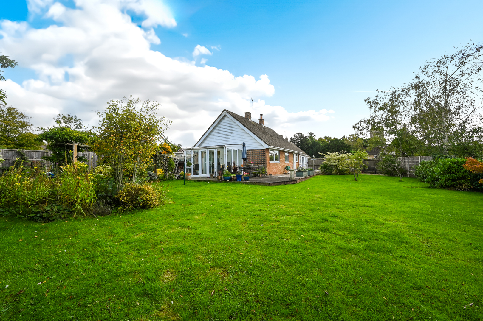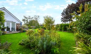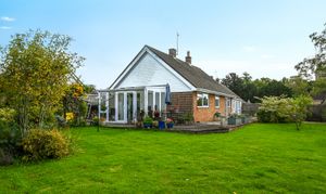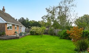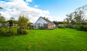Outside, the bungalow sits within a generous garden plot. The rear garden is mainly laid to lawn with mature planting, a decked terrace, and space for outdoor seating.