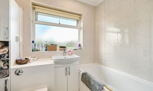 The family bathroom is fitted with a modern white suite including a bath with shower over, vanity unit with wash basin, and concealed cistern WC, with tiled walls and a frosted window.