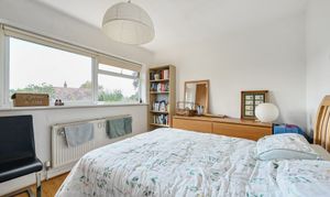 This bedroom features a wide window that provides good natural light and views over the surrounding area. The room is neutrally decorated with painted walls and wood flooring, and it offers space for a double bed along with additional furniture such as wardrobes or a chest of drawers.