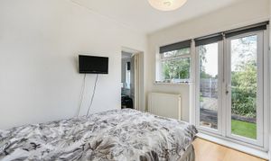 This bedroom includes an En-suite and has direct access to the garden through glazed double doors with an additional side window, providing good natural light. The room is finished with a neutral décor and laminate flooring, with space for standard bedroom furnishings.