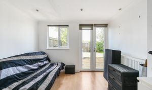 This bedroom is currently used as a spare reception room. The space includes a window and glazed doors opening directly to the garden, which bring in natural light and provide outside access. With neutral décor and wood-effect flooring.
