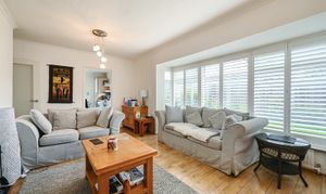 This is a bright reception room with a large bay-style windows. The room is laid with wood flooring and features a log-burning stove set within a fireplace surround. The space is well proportioned to accommodate multiple seating areas and benefits from a neutral décor, making it adaptable for various furnishings and uses.