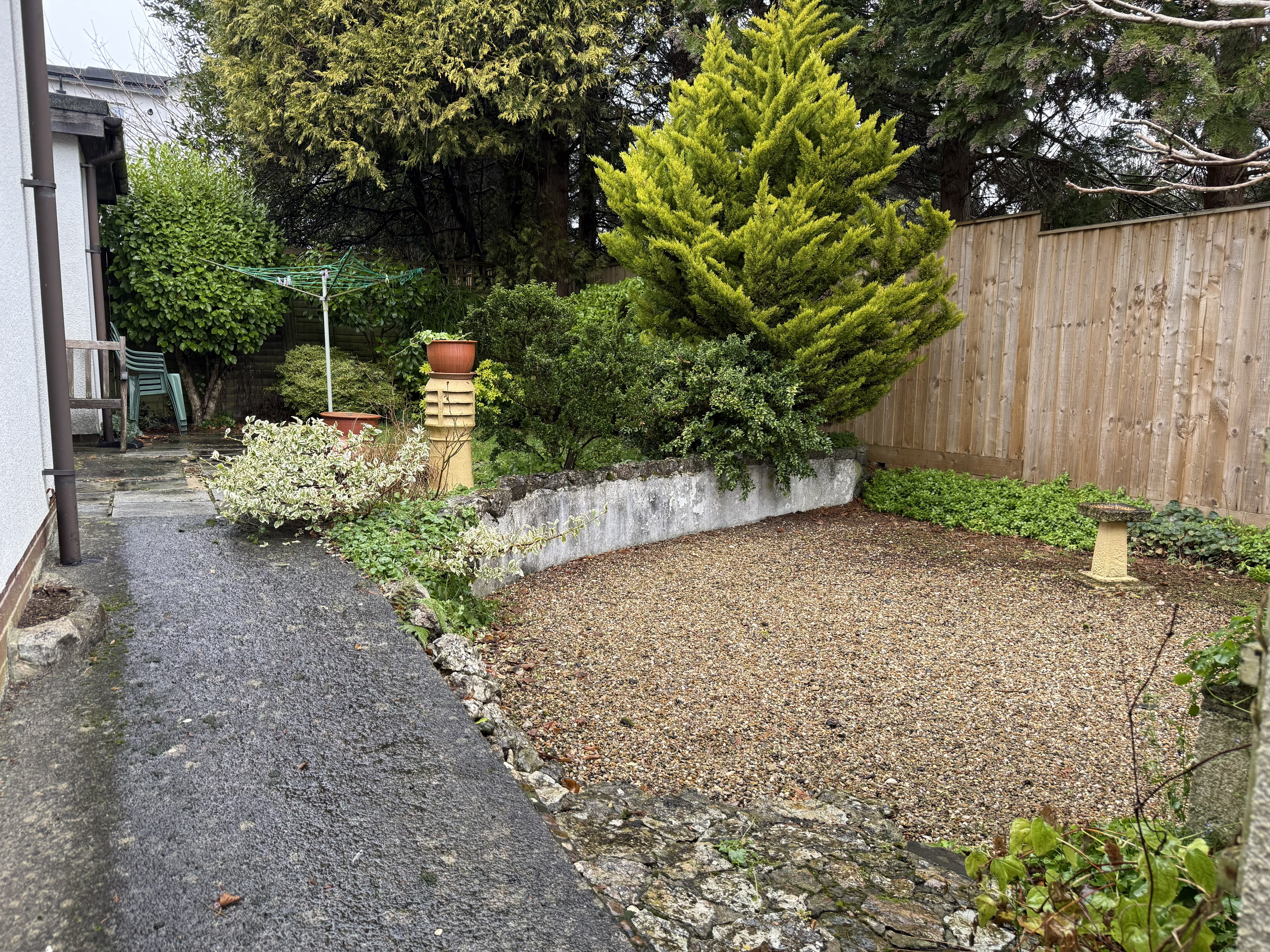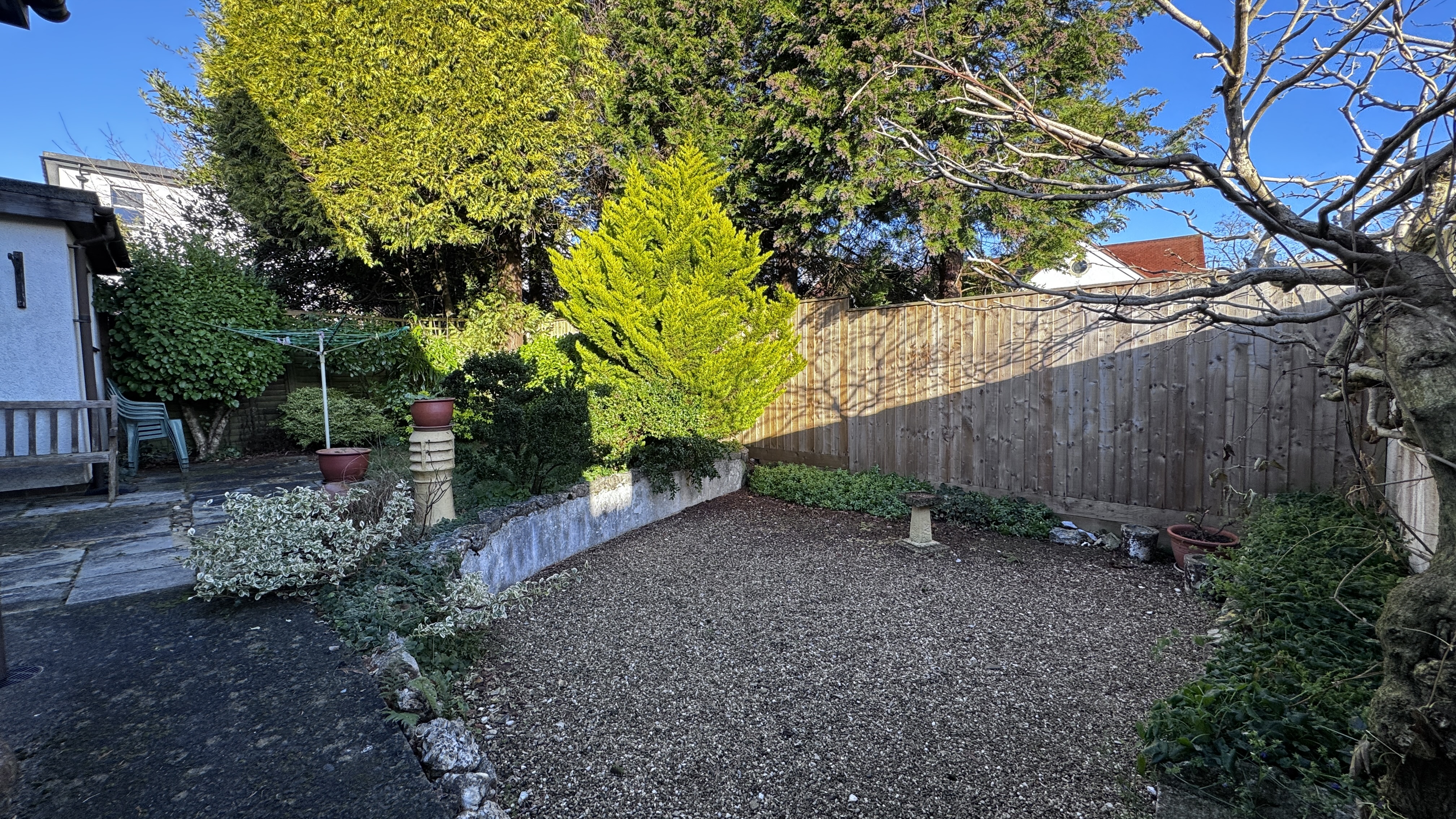 The rear garden is mainly laid to lawn and gravel with paved pathways and a slabbed patio area, all enclosed by timber fencing, providing a private and secure outdoor space.