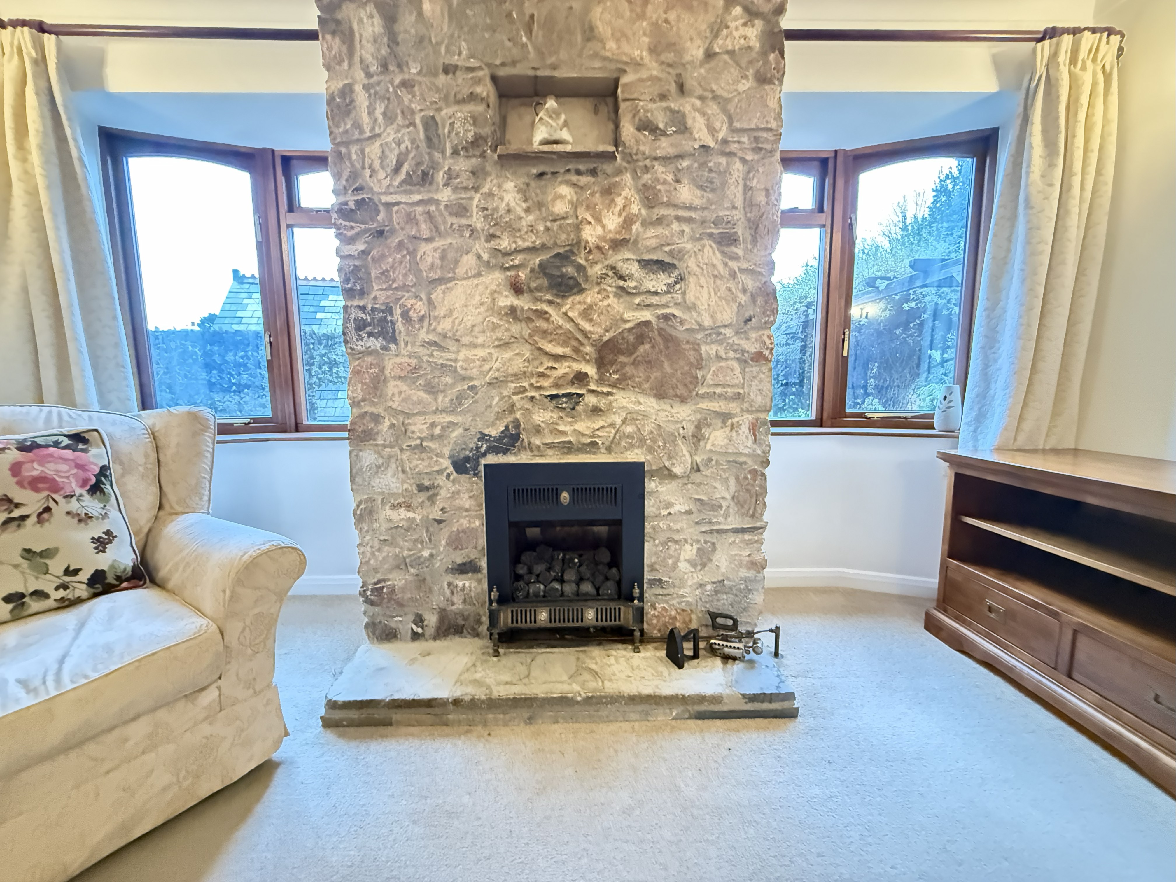 The lounge is a bright and comfortable room featuring a fireplace set within a bay-style window, creating an attractive focal point. The lounge opens through to the sun room, which enjoys plenty of natural light and provides direct access to the driveway, making it a versatile additional living space.