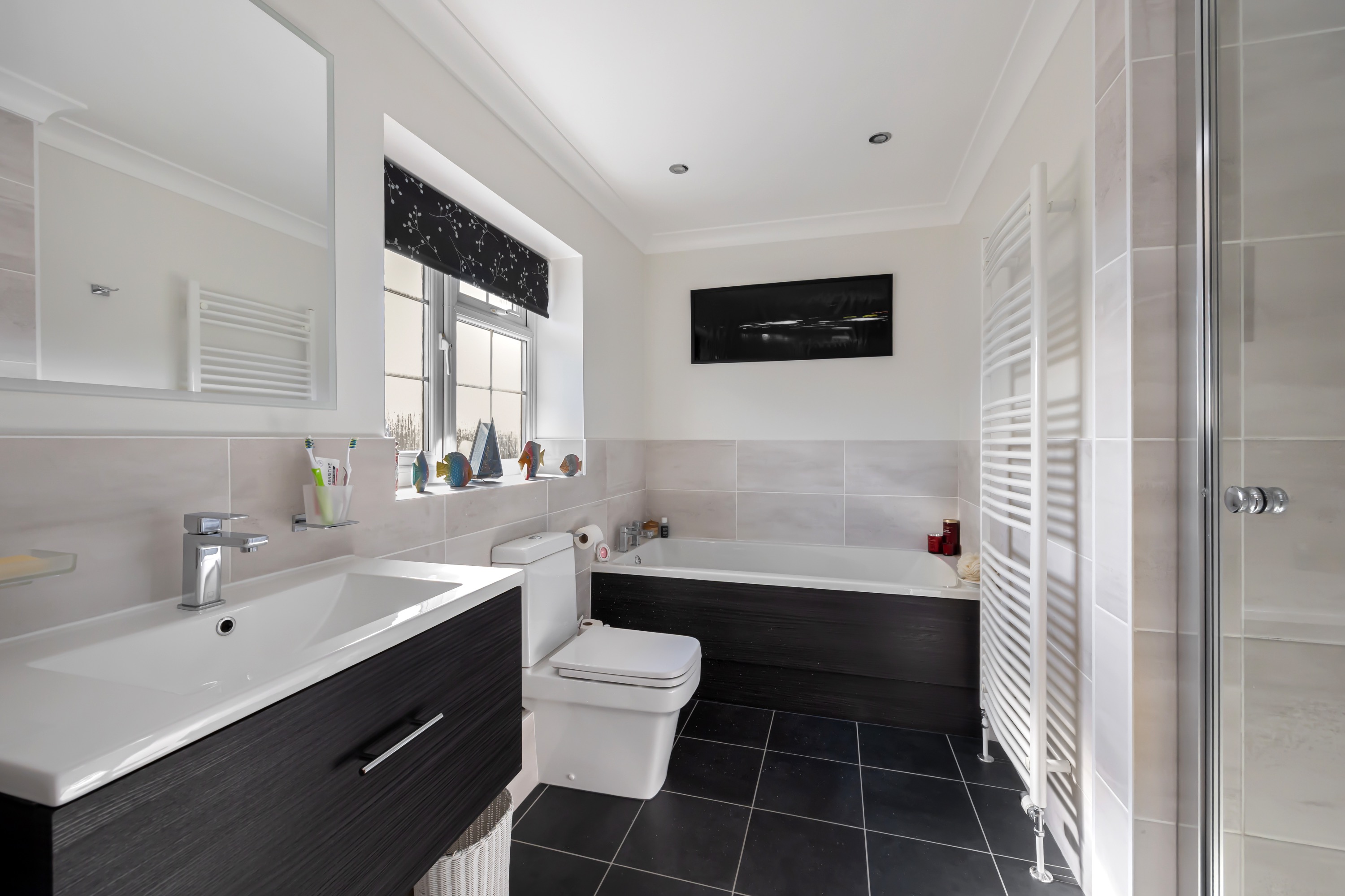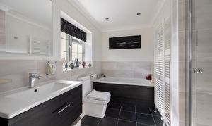 To the first floor; there are four bedrooms - all of which have fitted cupboard or wardrobe space, the generous en-suite bathroom is equipped with a walk-in rainfall shower, separate bath, a low-level WC and a wash hand-basin, it is finished to a modern and contemporary style with a heated towel rail and all the bathroom ware is complimented with quality chrome fittings. There is also a family bathroom which features a wash hand basin, low level WC and a bath with shower over.