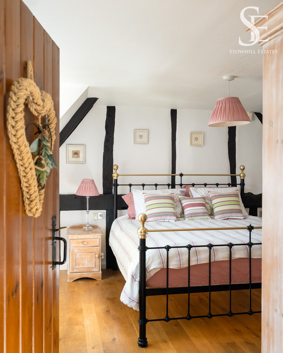 An oak, open tread staircase leads up from the sitting room to the principal bedroom – a private, peaceful haven, washed in light from windows framing views out over both the front and rear gardens, and evoking quaint cottage comfort with its angled roofline and exposed timbers.