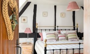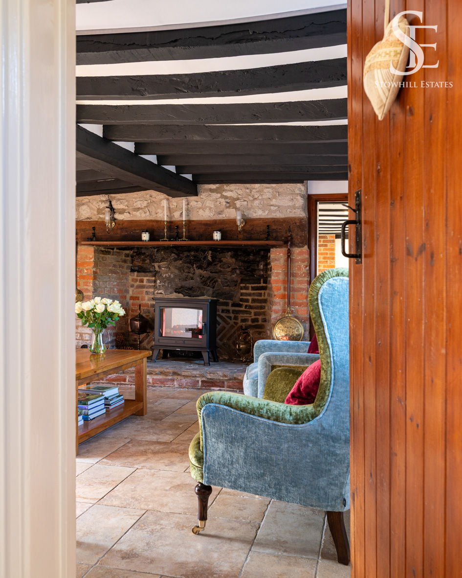 Offering further space in which to relax and unwind, windows to two sides flood the sitting room in natural light, which is amplified by the whitewashed walls allowing the treacle-toned beams to stand out by contrast overhead. On crisp winter evenings, snuggle up in front of the inglenook fireplace with its exposed bricks and stone, where a log-burning effect stove infuses warmth and welcome.