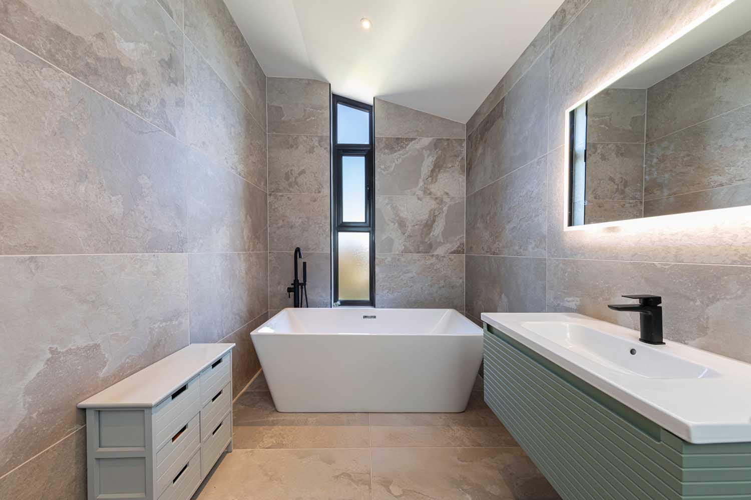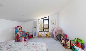 A bespoke oak floating staircase rises to the first-floor landing, enclosed by a glass balustrade and stretching the full width of the house. From here, five generously proportioned double bedrooms are arranged, each thoughtfully designed to make the most of far-reaching countryside views. Four enjoy stylish en-suite bathrooms, finished to a high standard. The principal bedroom overlooks open fields through full-height glazing, while another features an adjoining versatile room currently used as a dressing area, though equally well-suited as a cinema room or dedicated home office.