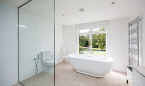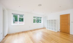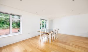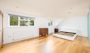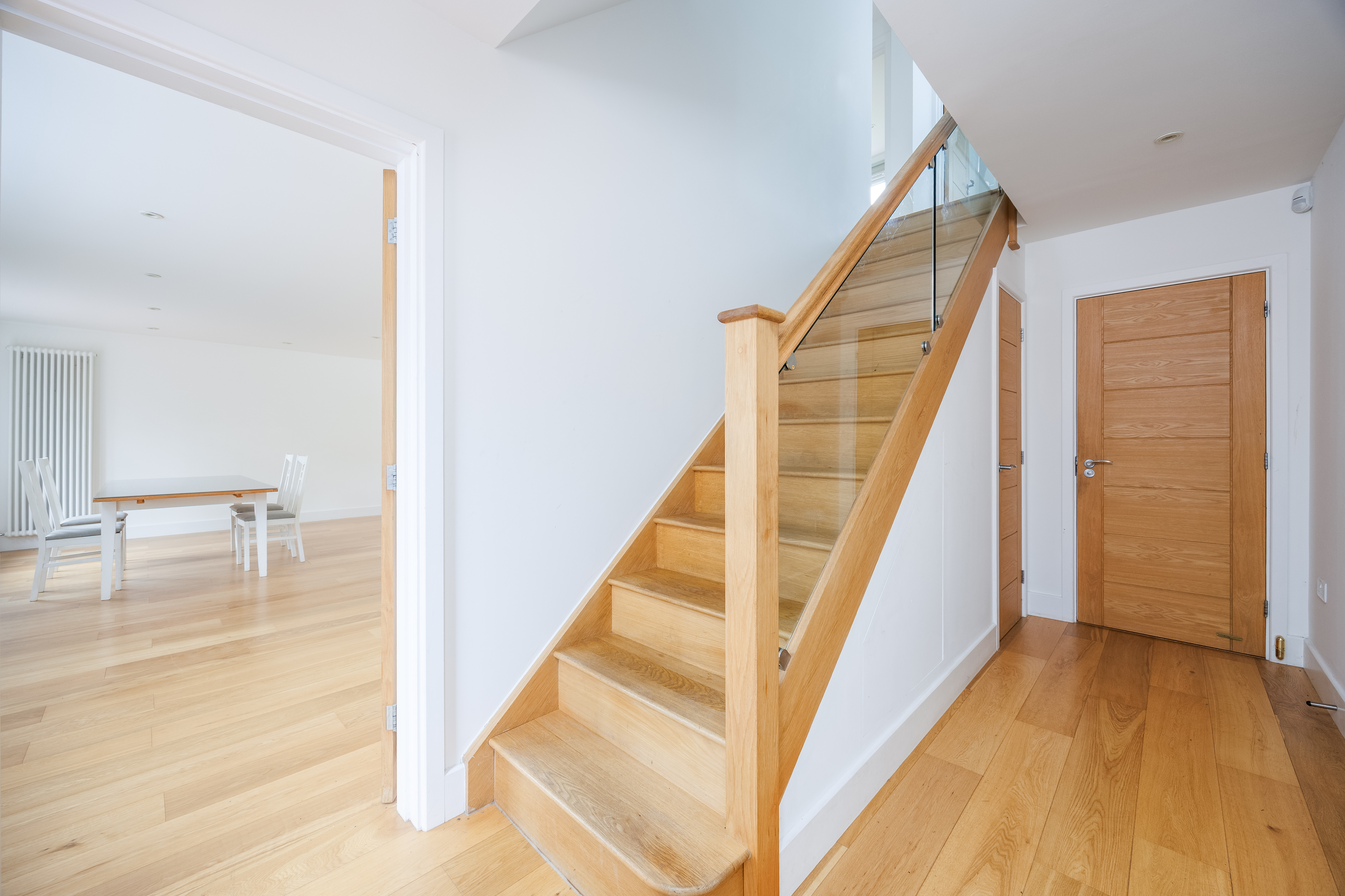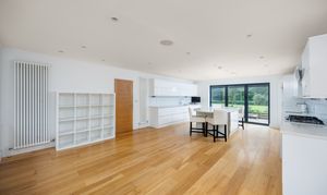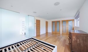 To the left is the impressive 25’9 × 23’1 LIVING ROOM with woodburner & bifold doors to the garden. On the first floor there is a landing with glass balustrade, a master bedroom with FABULOUS EN SUITE BATHROOM, walk in shower, free standing double ended bath, underfloor heating & frosted glass room divider.