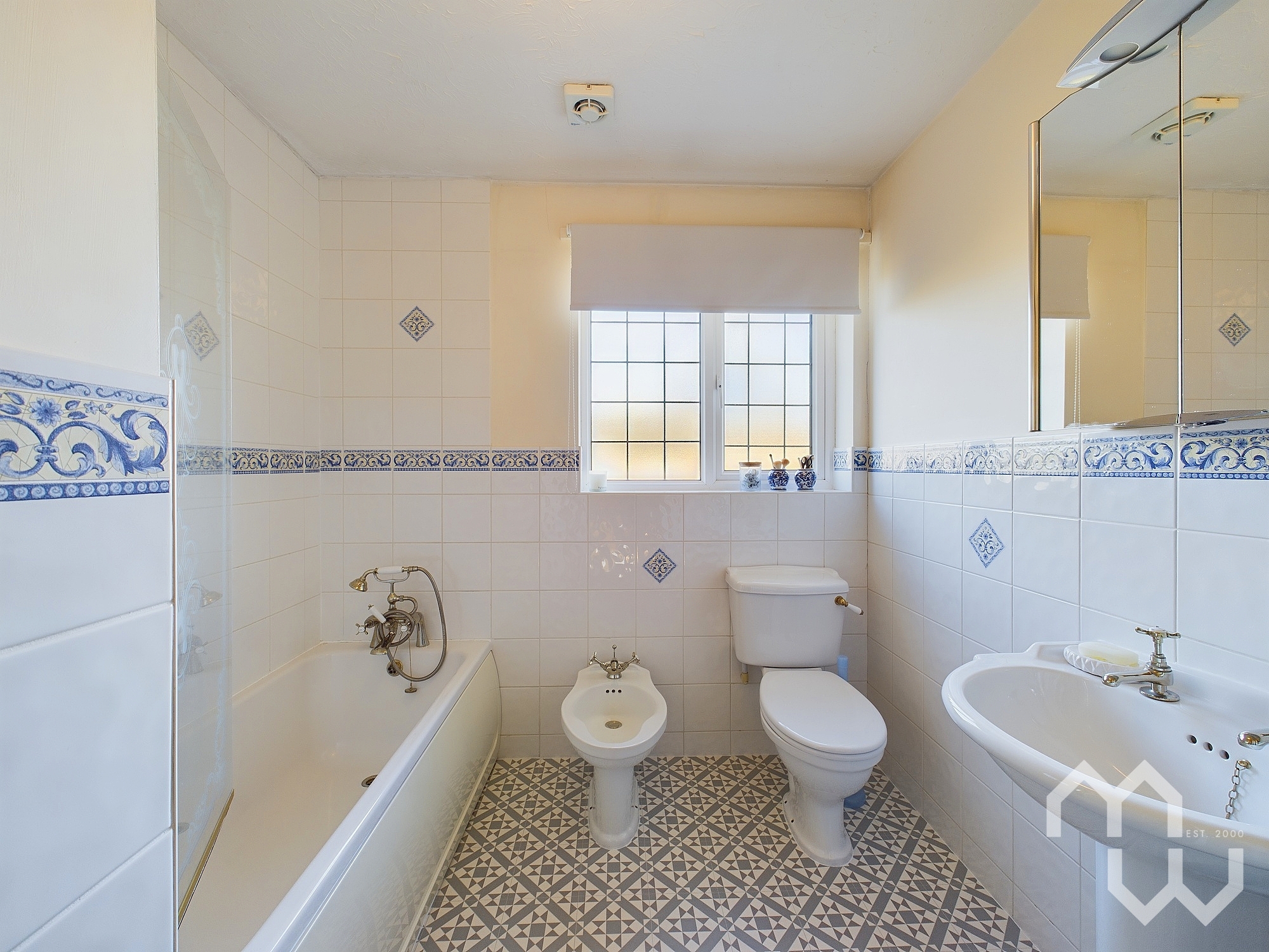 Four piece suite compromising: Panelled bath with mains shower over, pedestal wash hand basin, low level WC, bidet and window to rear.
