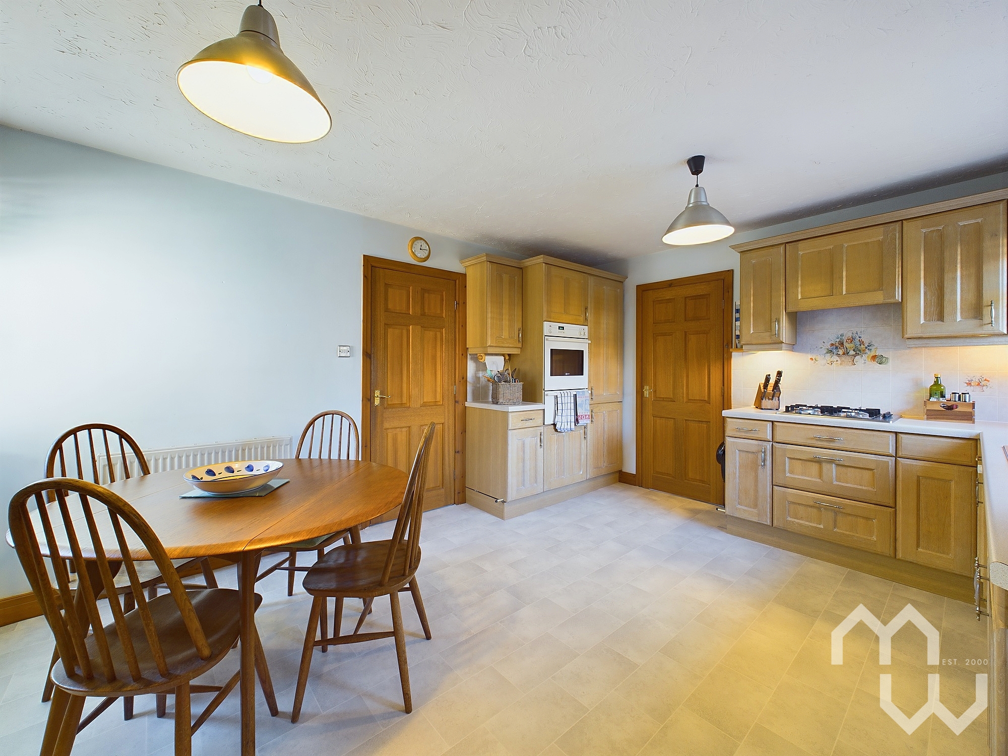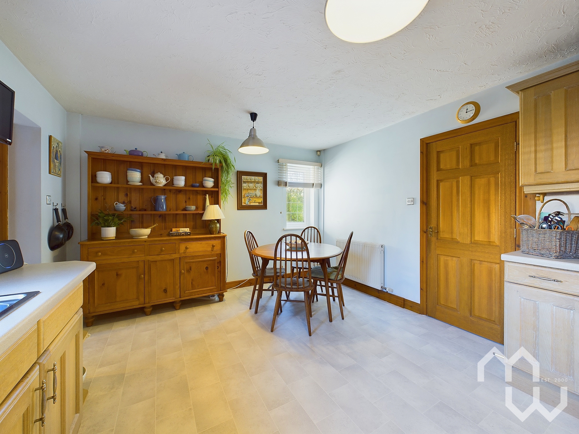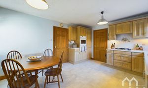 Spacious kitchen with good range of eye and low level units with 1 1/2 Frankie stainless steel sink, integrated appliances include: Neff dishwasher, fridge freezer, Neff electric ovens, gas hob. Large dining area. Windows to rear and side.