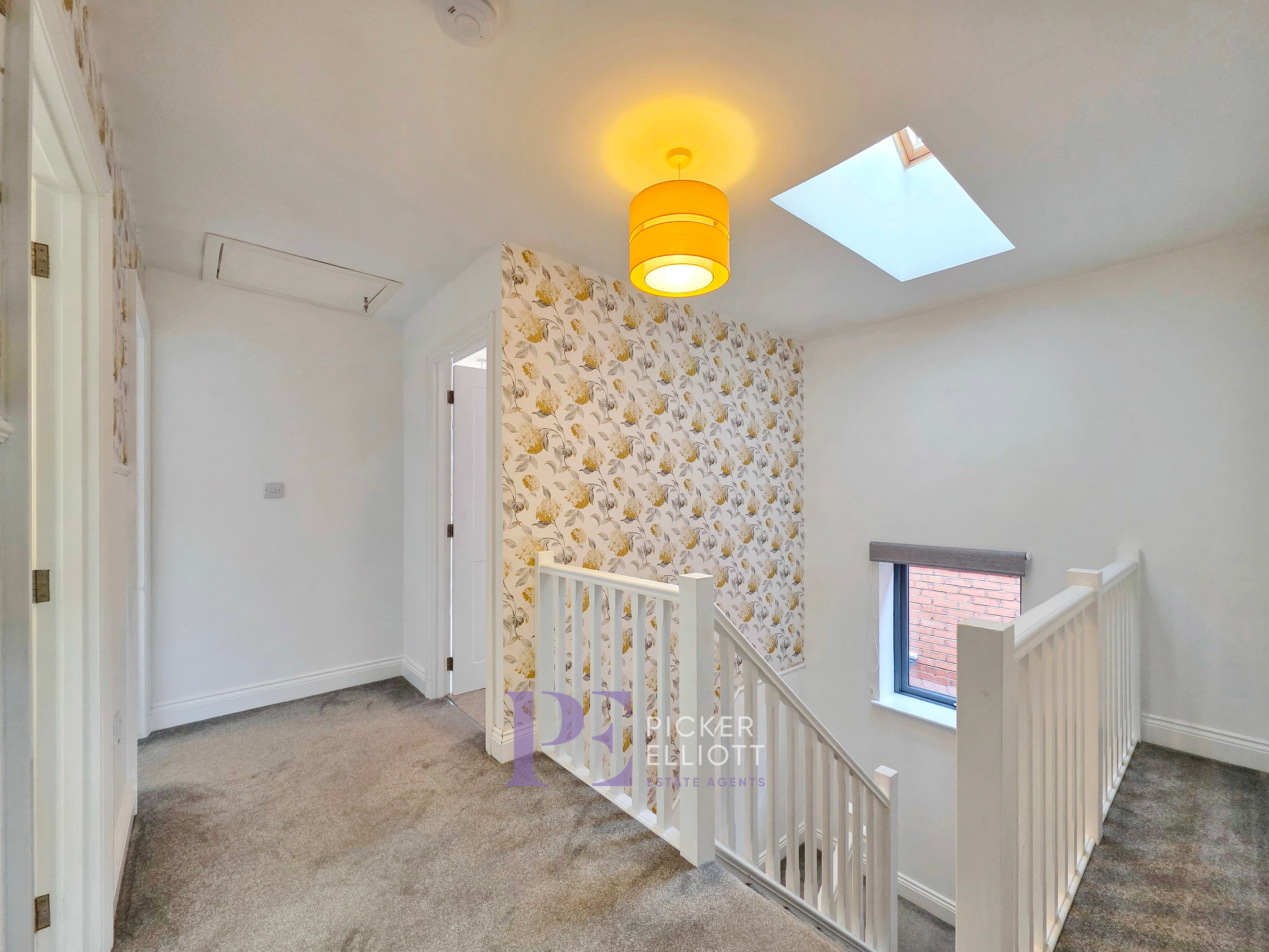 Galleried landing with ceiling window, spindled balustrade, double glazed window, loft access