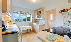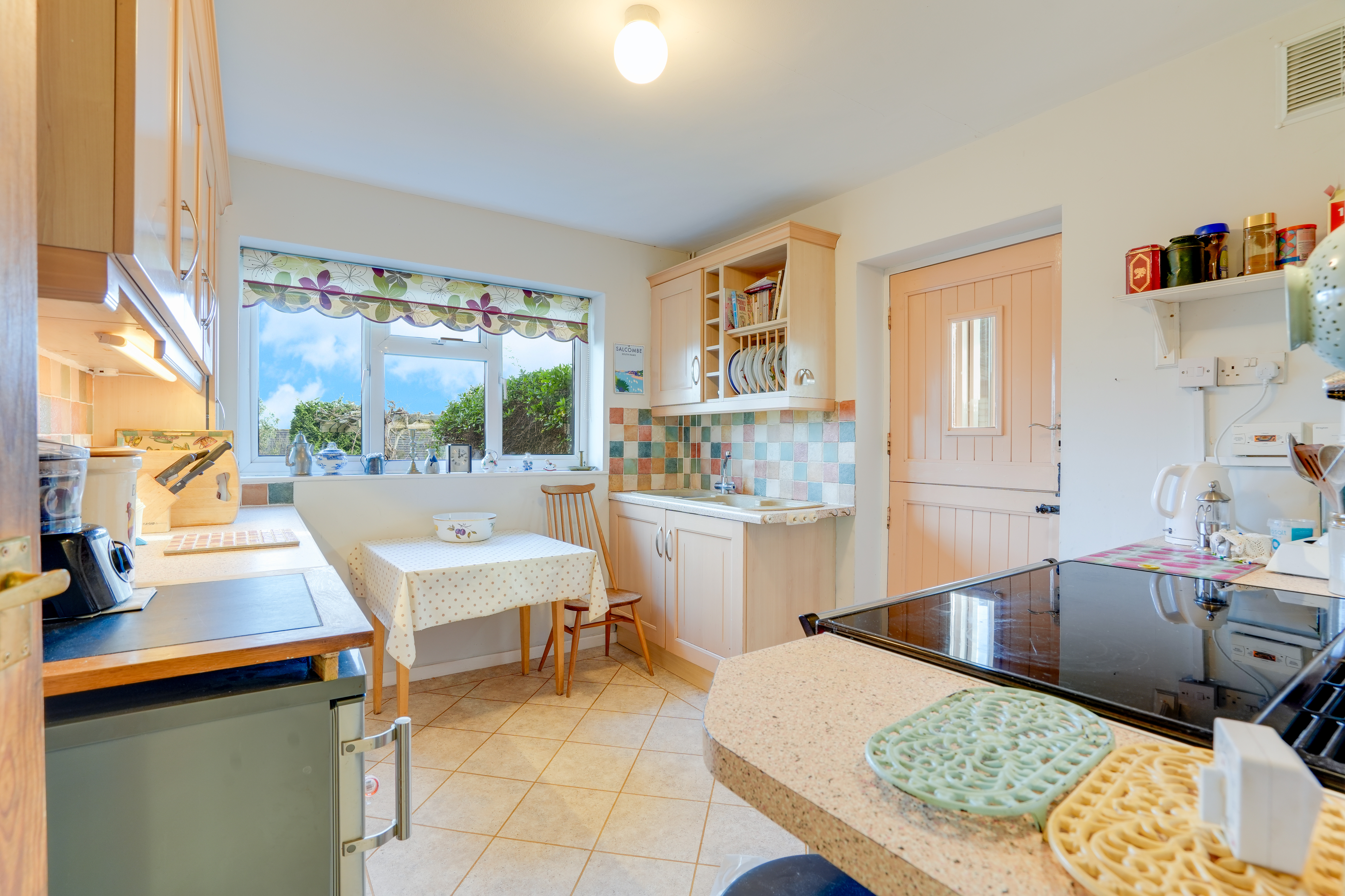 A lovely light and bright room with a door from the conservatory and a large window overlooking the gardens beyond. It has fitted floor and wall mounted units with space for an under-counter fridge as well as an electric five hob, three oven Rangemaster cooker with tiled splash back. It has space fora table and chairs under its window.