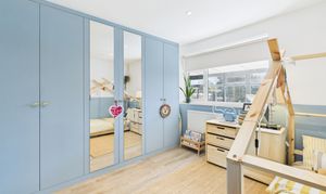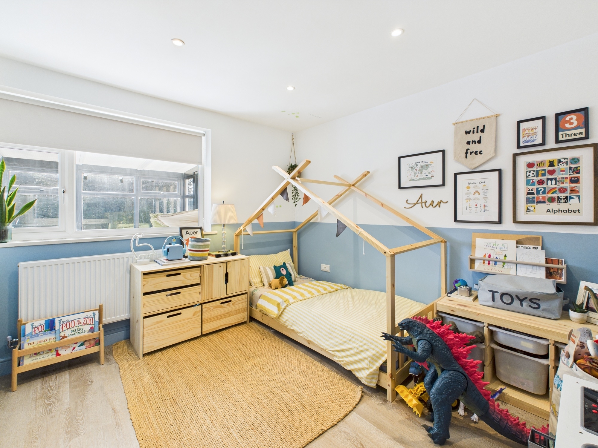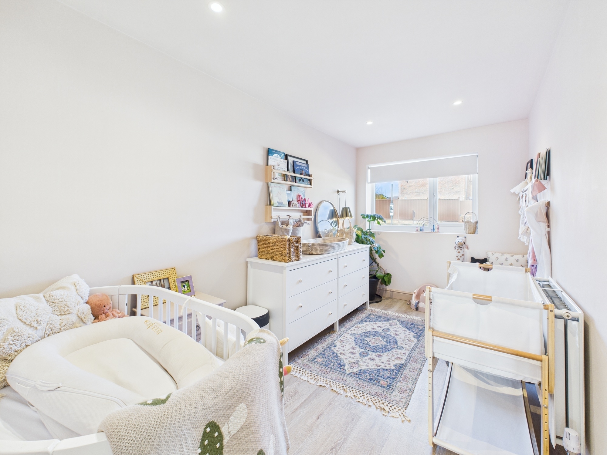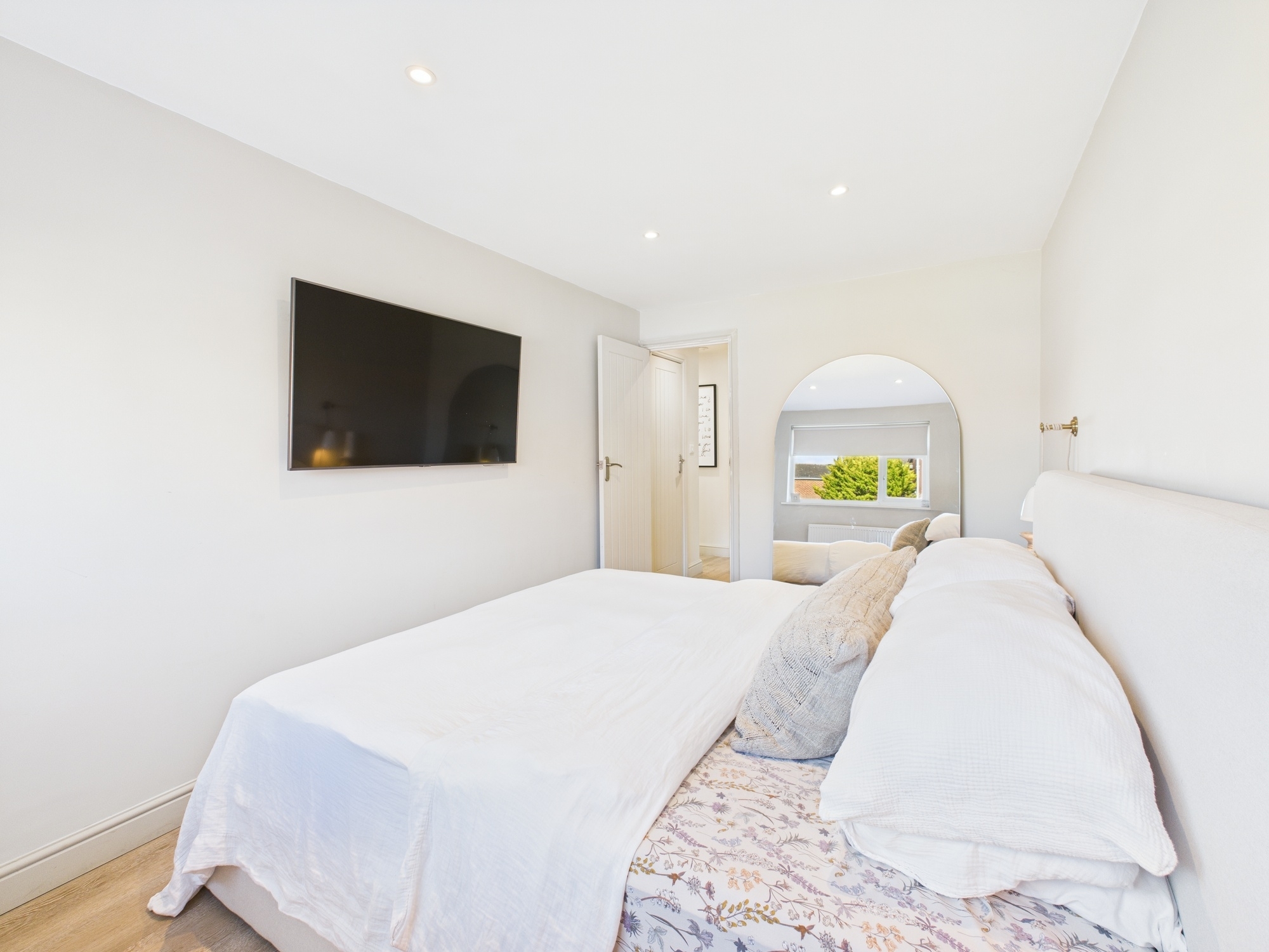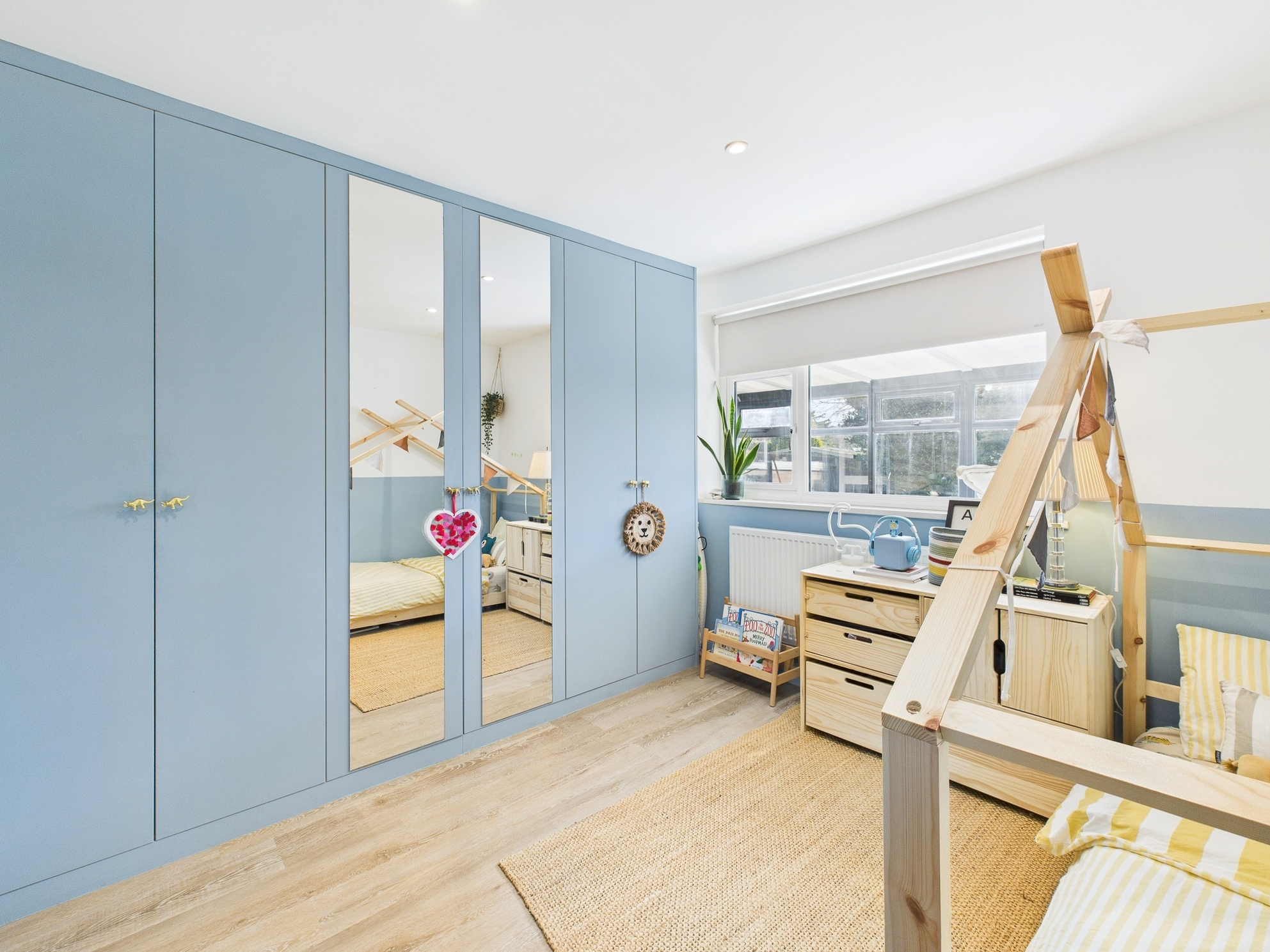 Window to the rear into the conservatory. Fitted wardrobes with hanging rails, shelving and drawers. Radiator.