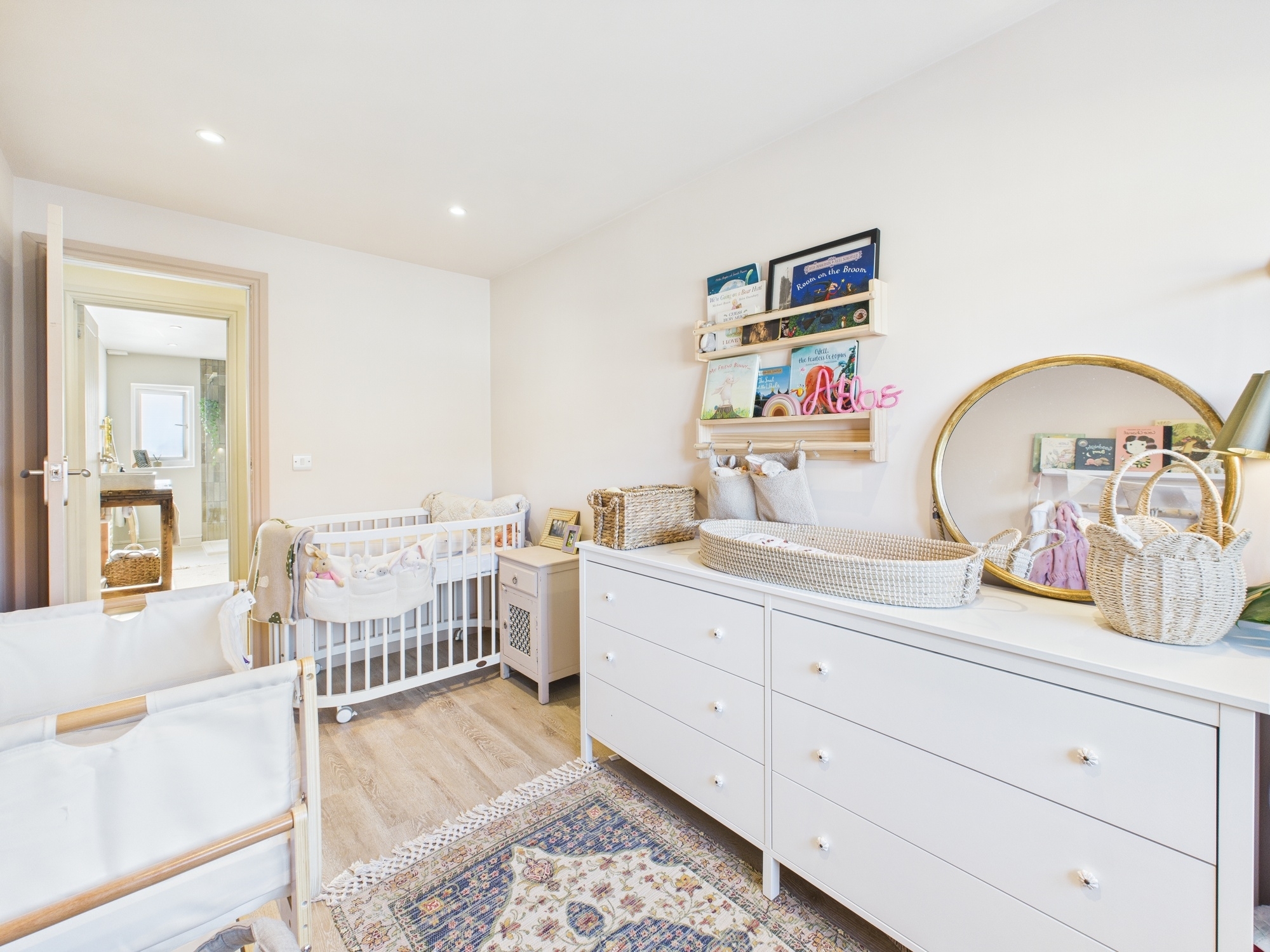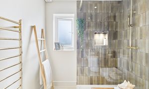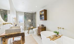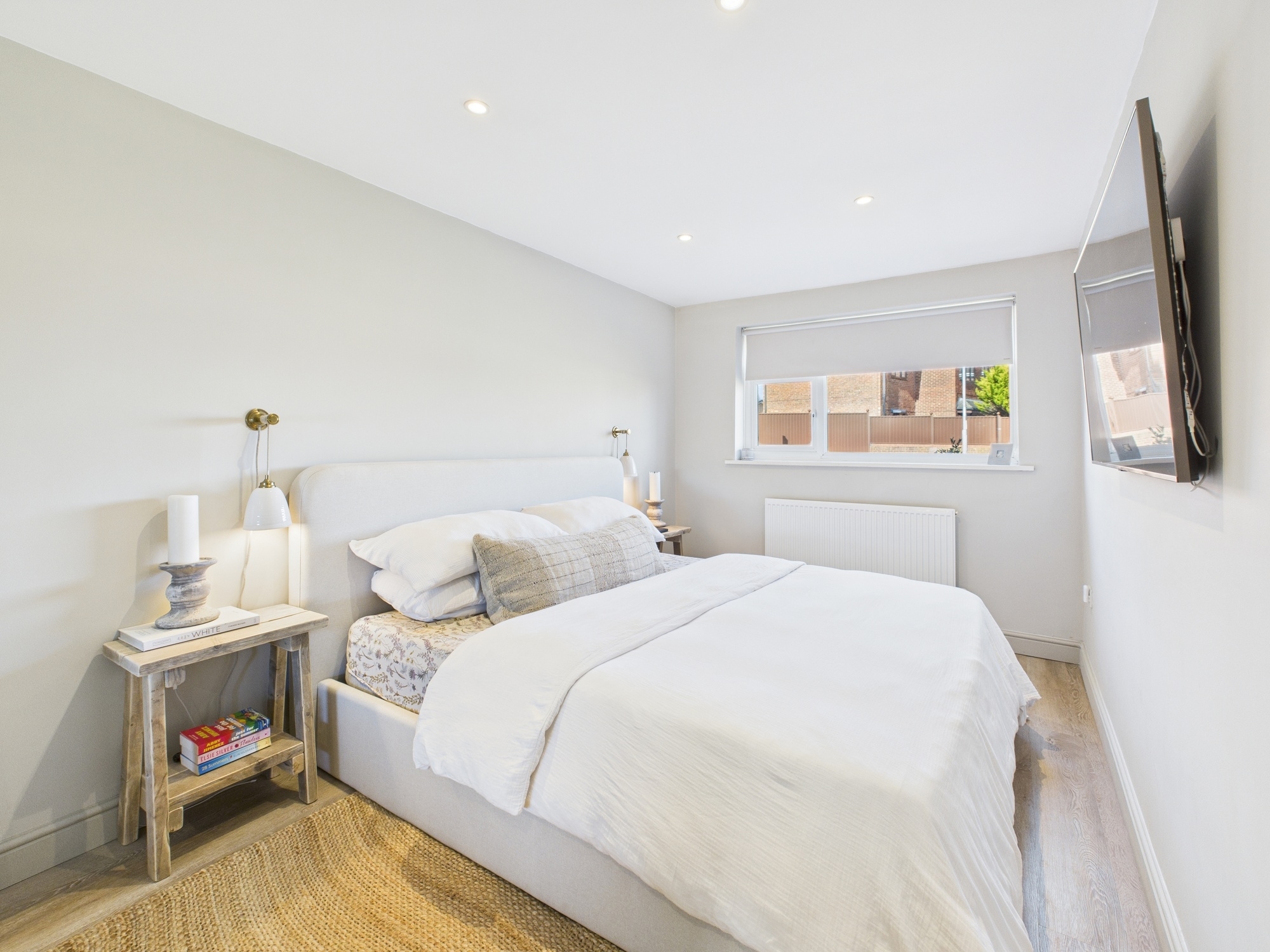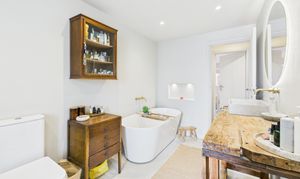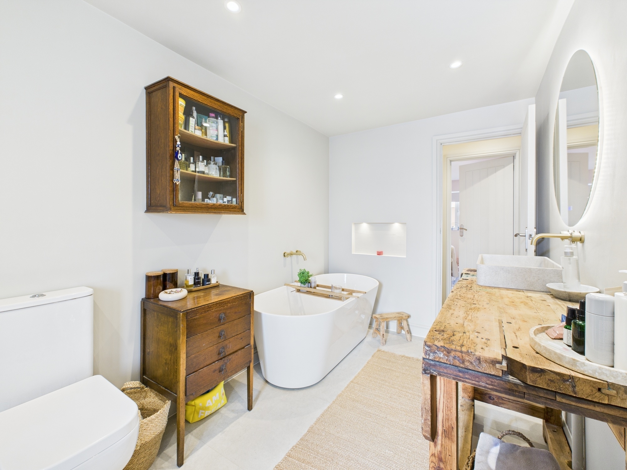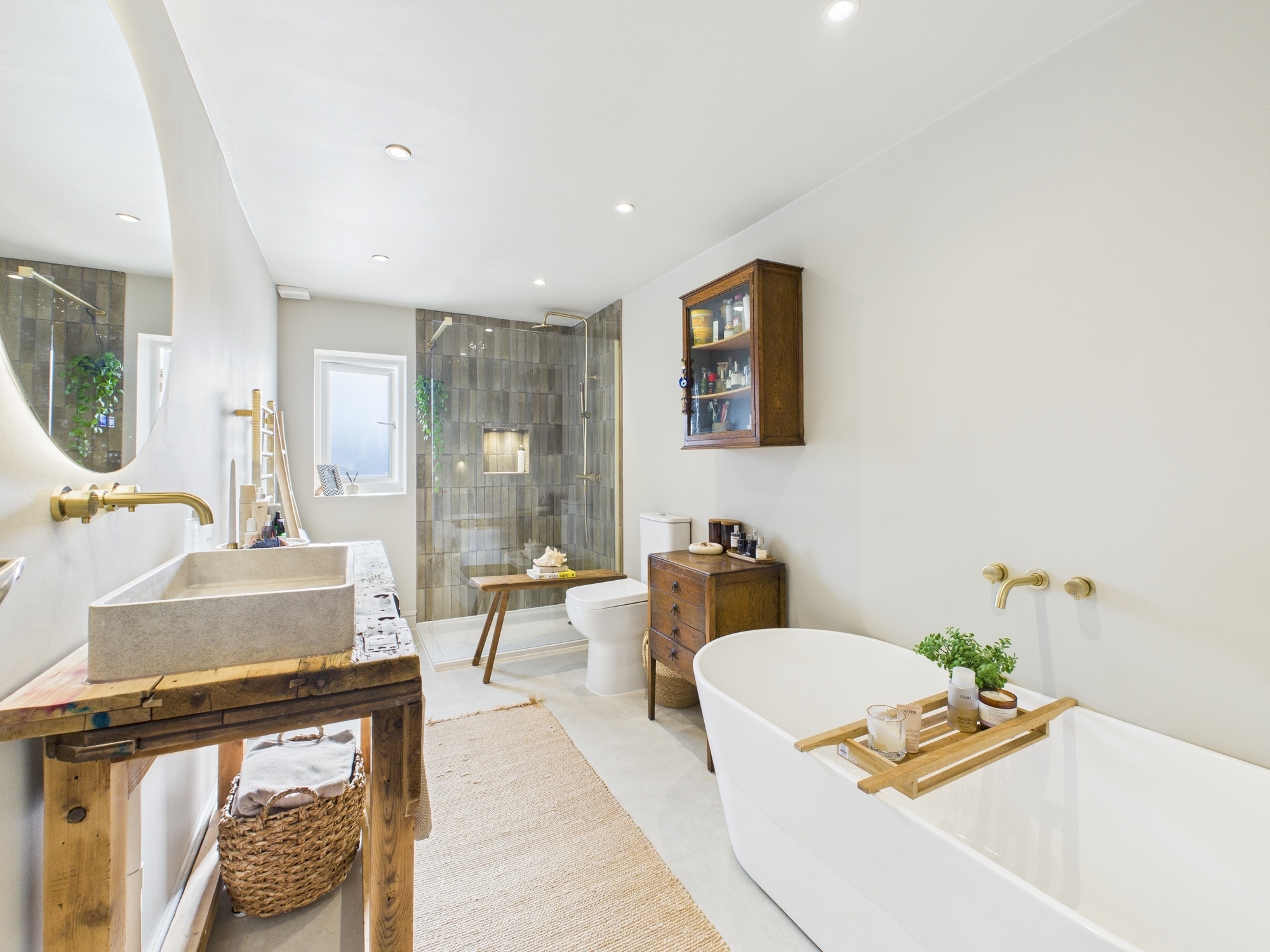 Fitted with a four-piece suite comprising a shower enclosure with rainfall and handheld shower heads, a bath, bespoke wash basin/vanity unit and a W.C. Heated towel rail. Window to the rear.