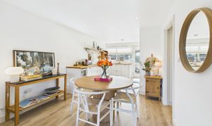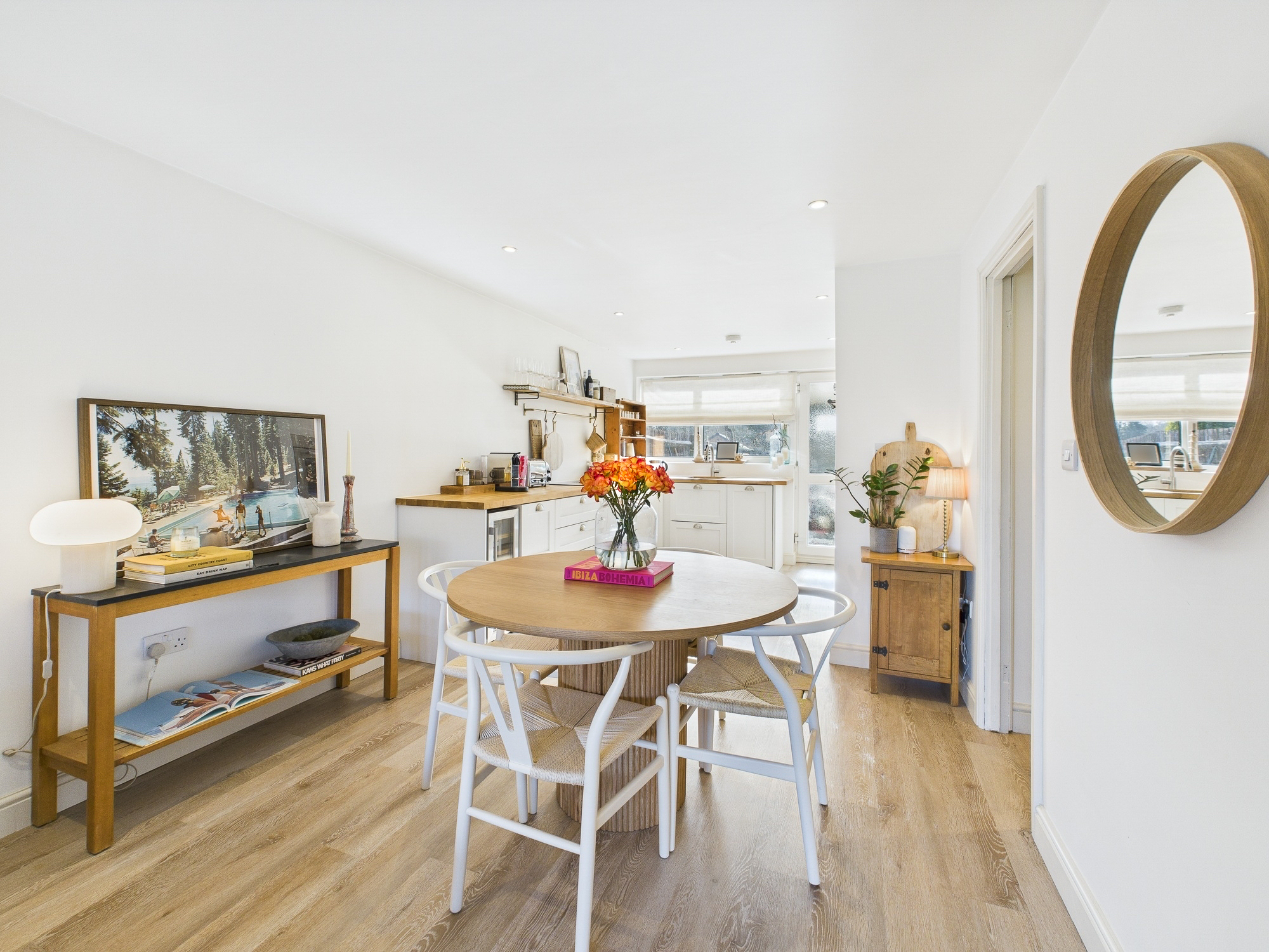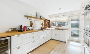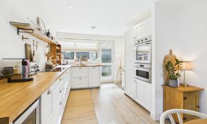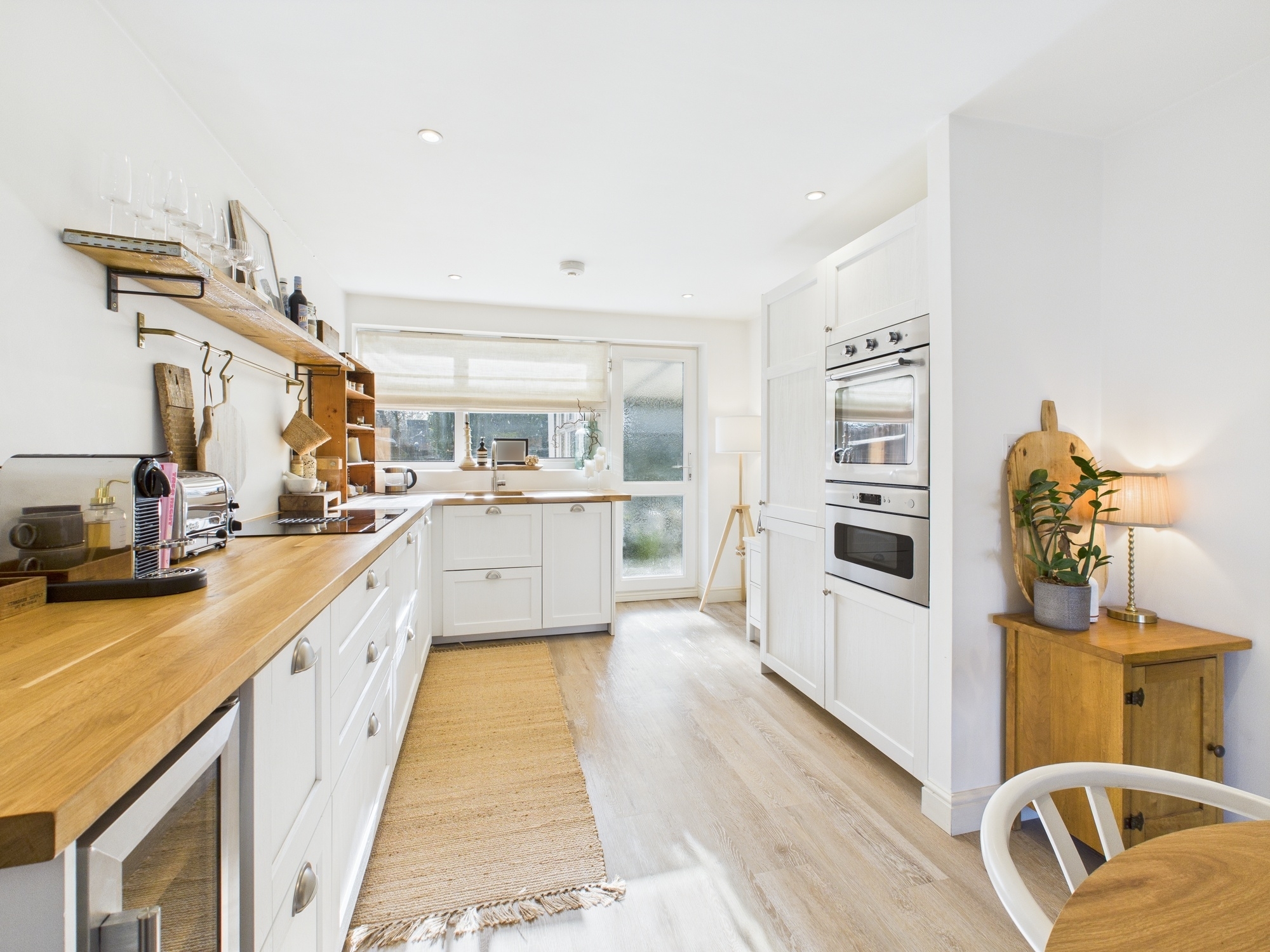 Fitted with a range of base and wall units with wooden working surfaces. Under mounted stainless steel sink with mixer tap, integrated fridge/freezer and dishwasher, wine cooler, eye-level single oven and microwave with a separate four-ring induction hob with built-in extractor. Window to the rear. Vertical radiator.