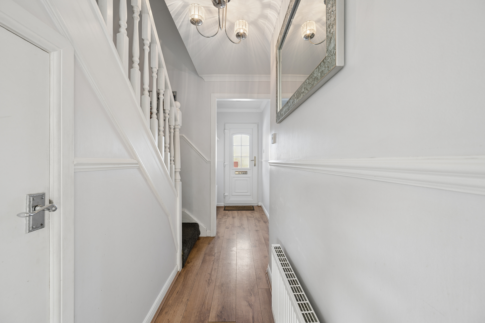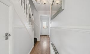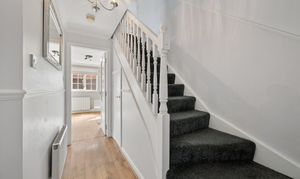 Stepping inside, you are greeted by a bright entrance hallway, finished with crisp white décor, decorative wall panelling and warm wood effect flooring that flows seamlessly throughout the ground floor, enhancing both style and continuity. A convenient ground floor WC is also located just off the hallway.