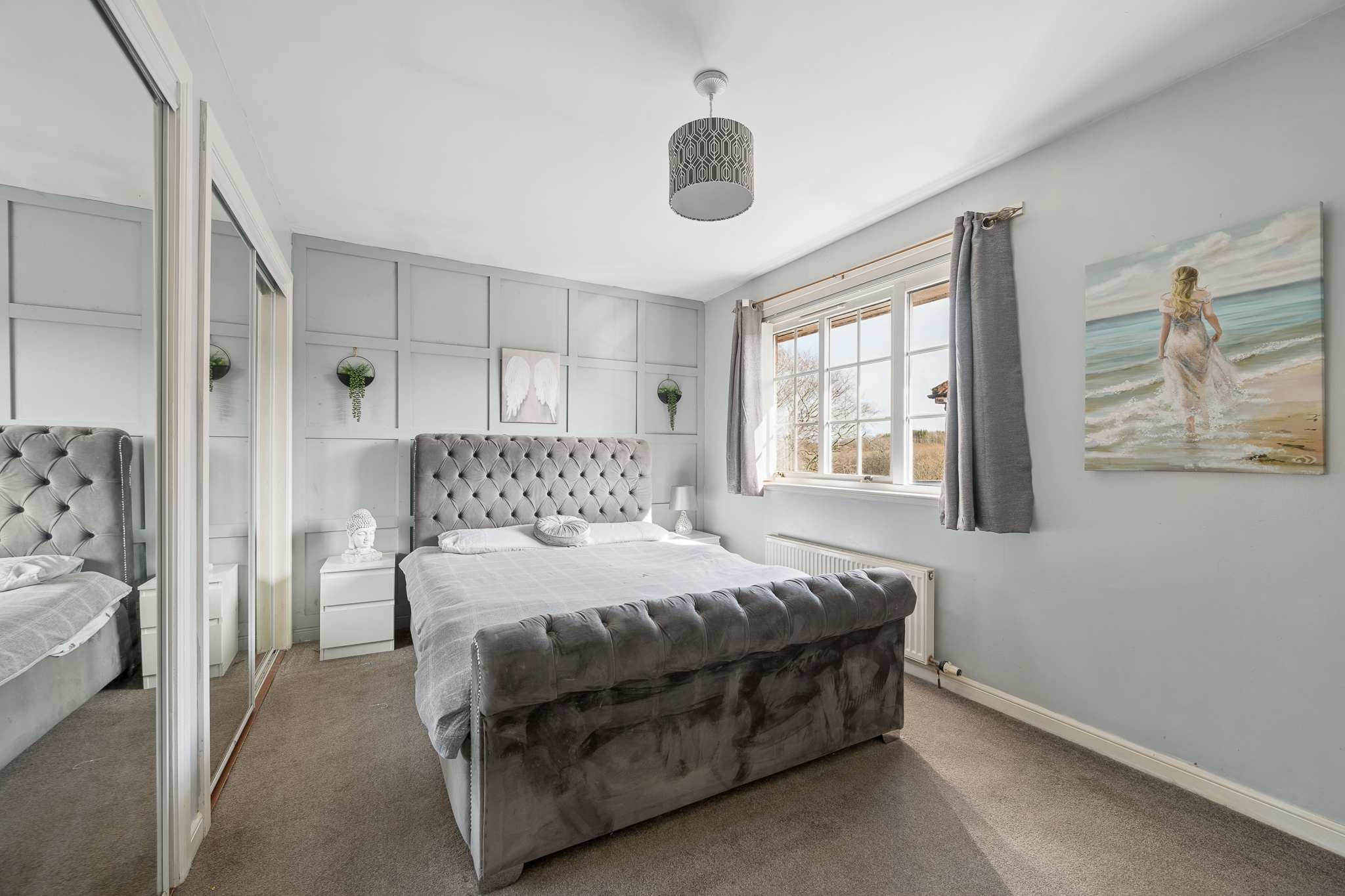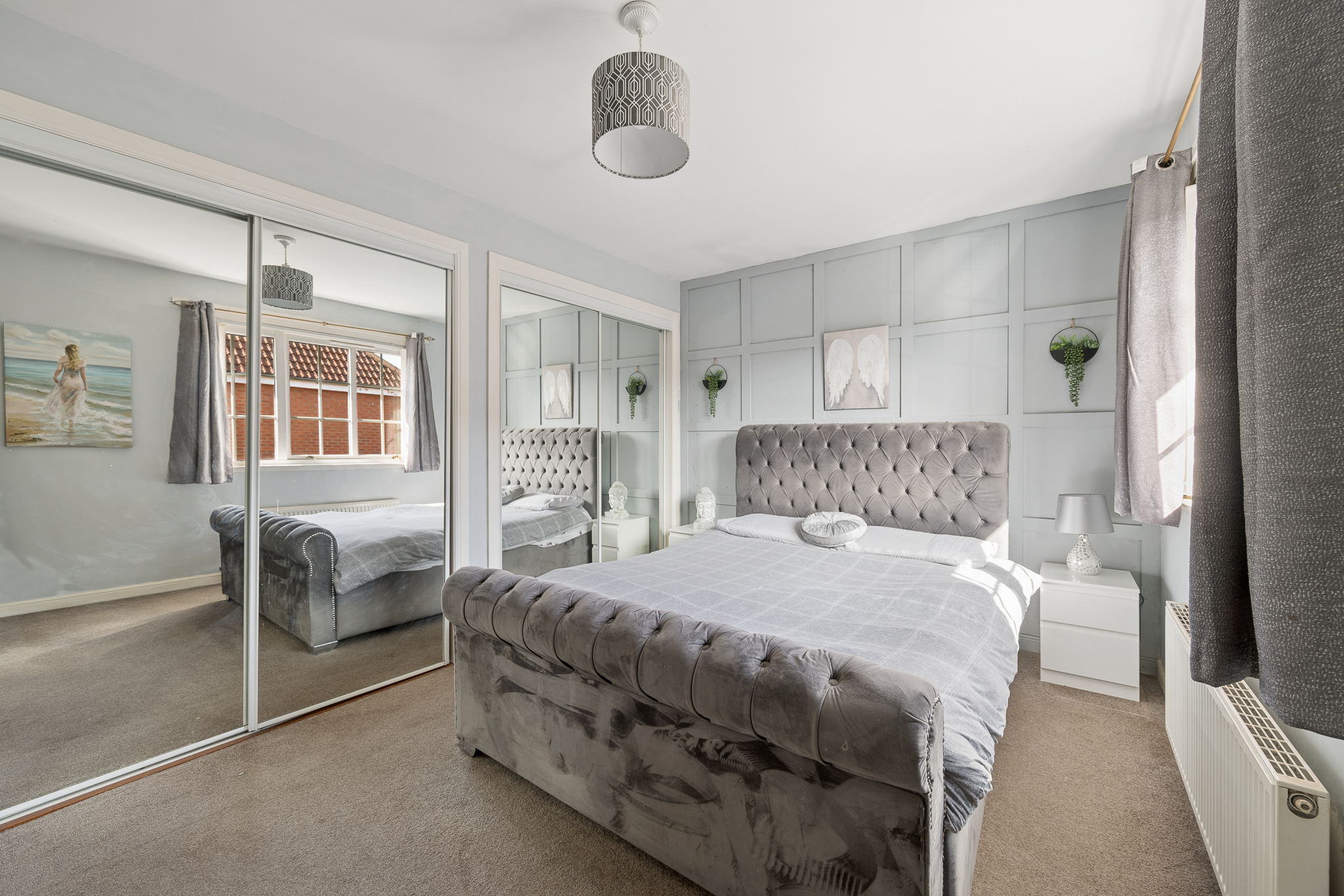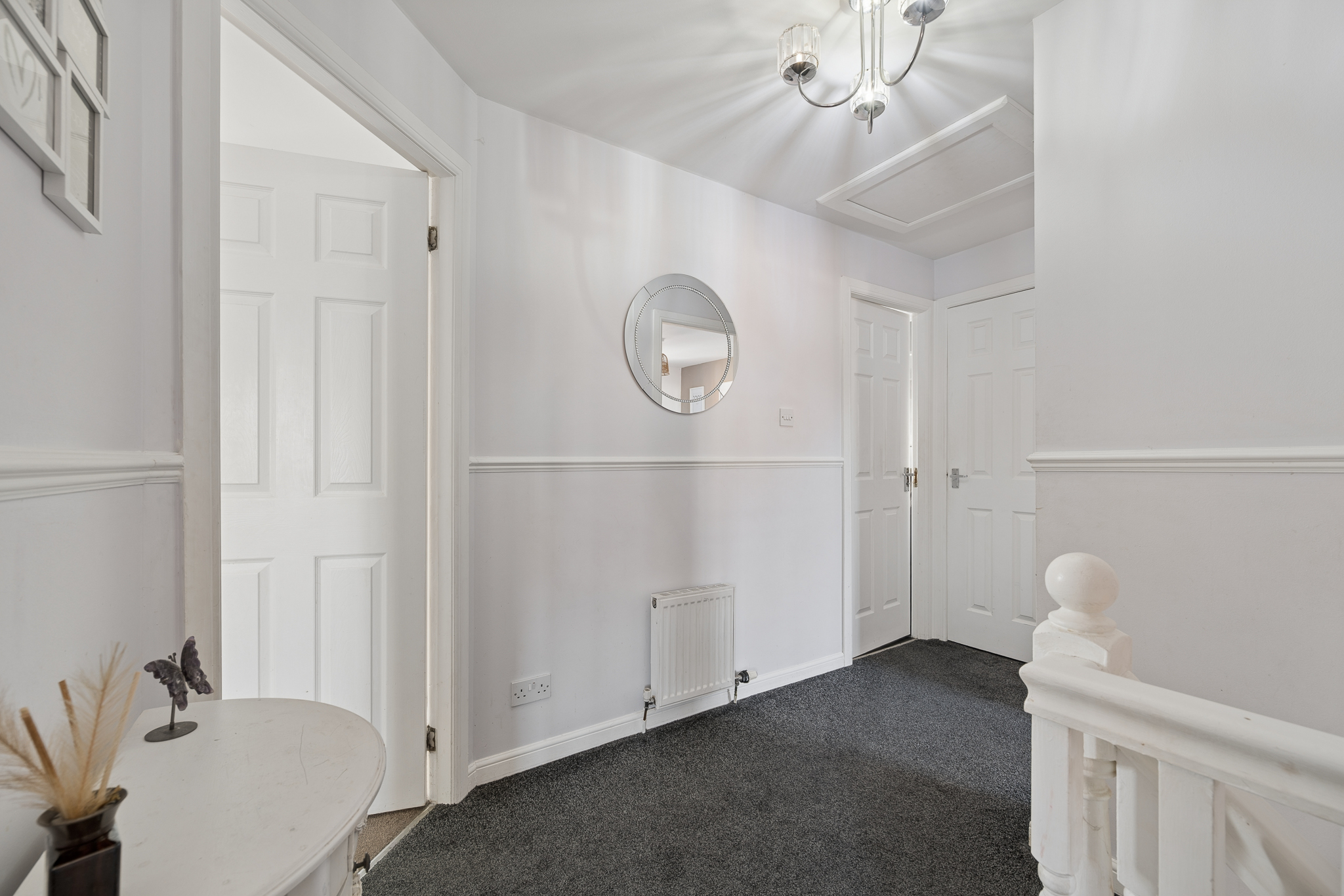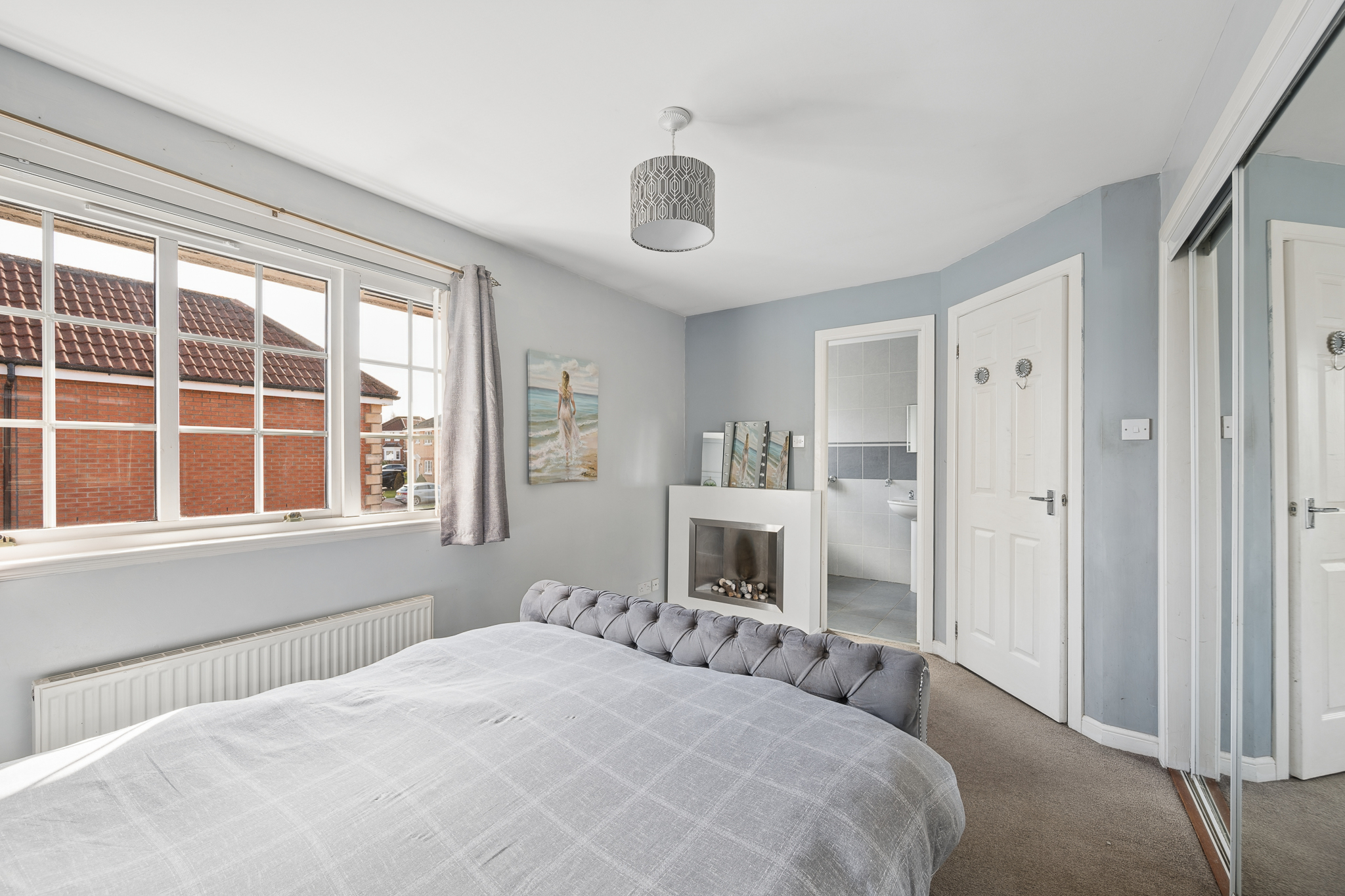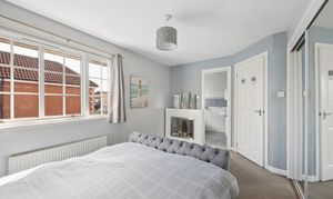 Upstairs, the landing leads to three well proportioned bedrooms. The principal bedroom is a beautifully presented retreat, complete with fitted mirrored wardrobes, soft neutral tones, plush carpeting and a modern en-suite shower room finished with contemporary tiling.
