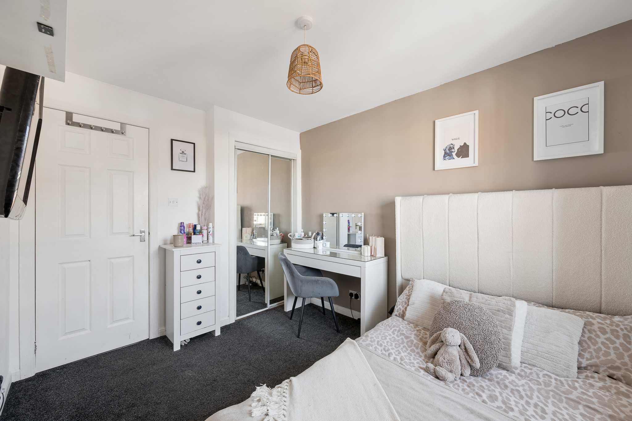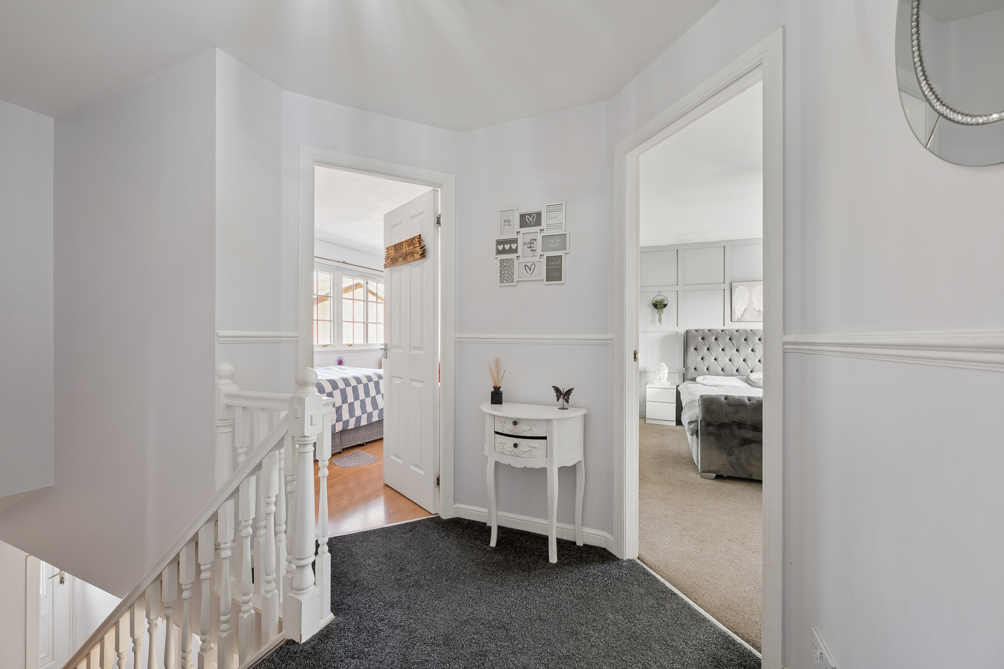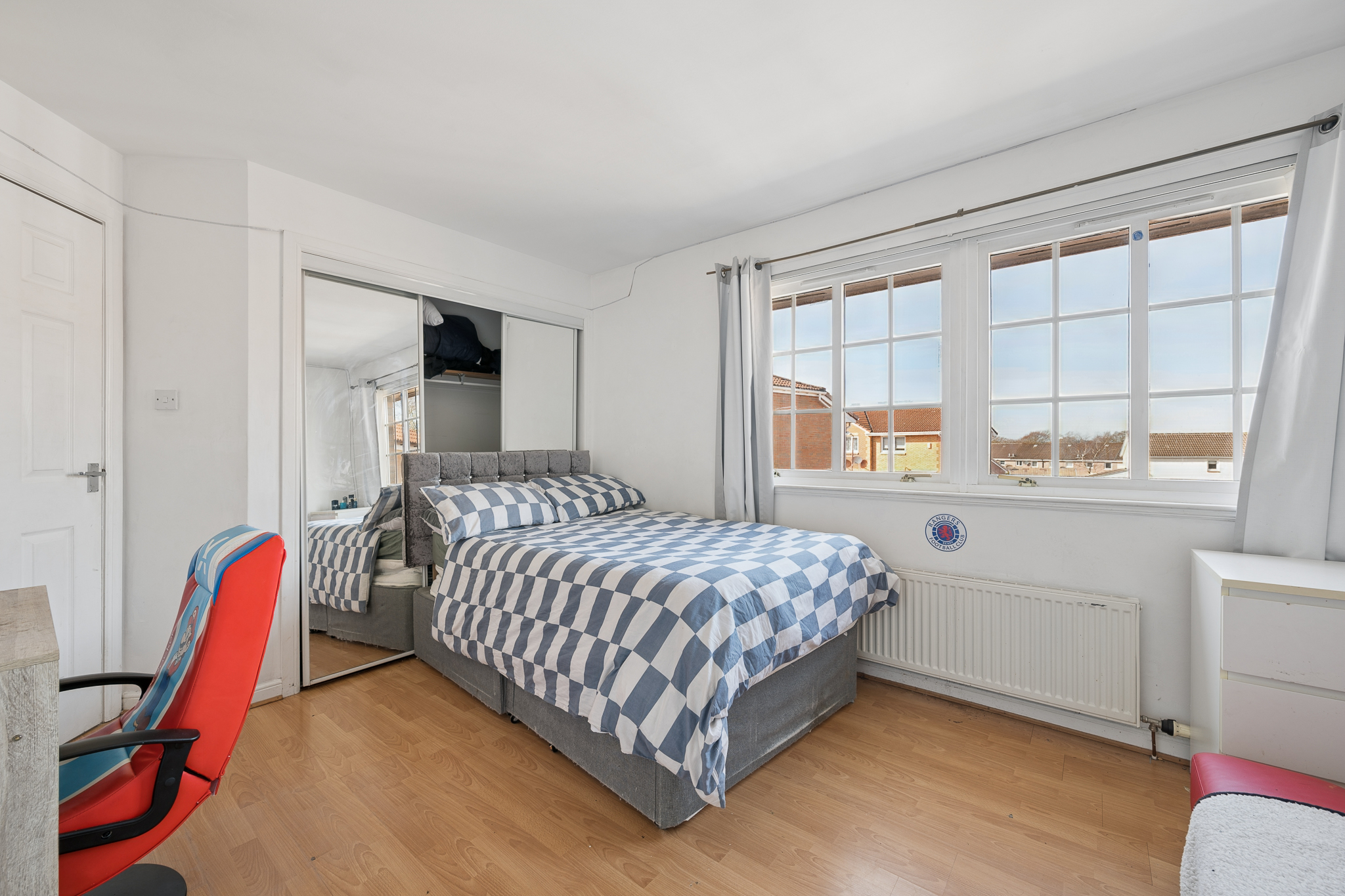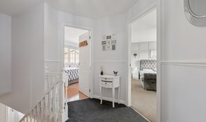 Upstairs, the landing leads to three well proportioned bedrooms. The principal bedroom is a beautifully presented retreat, complete with fitted mirrored wardrobes, soft neutral tones, plush carpeting and a modern en-suite shower room finished with contemporary tiling.