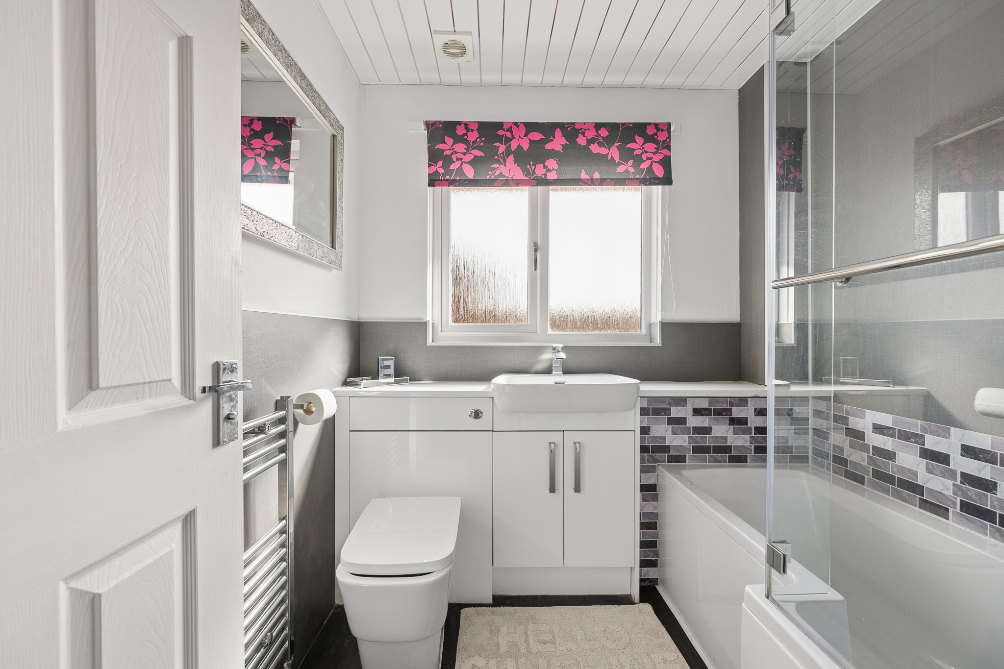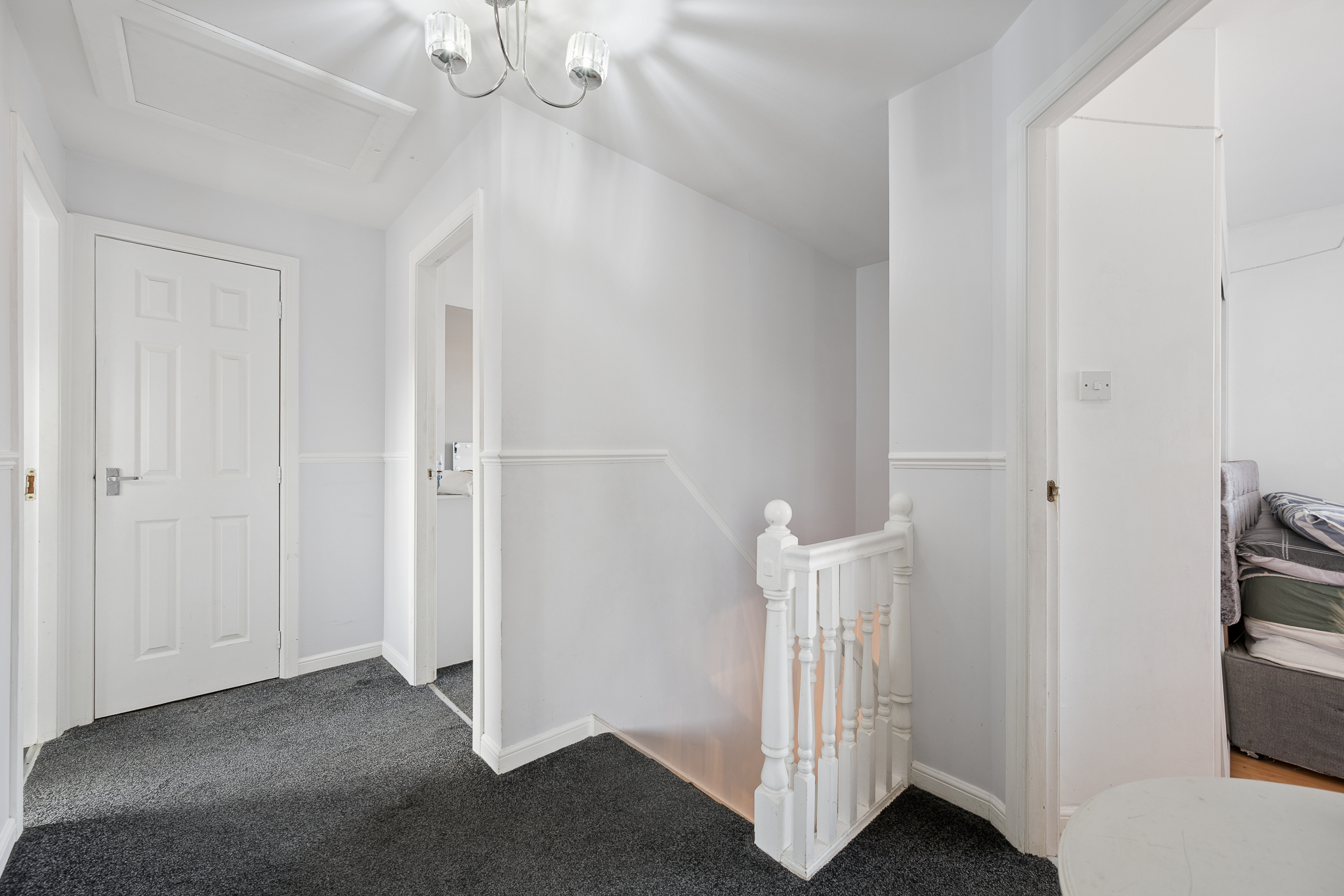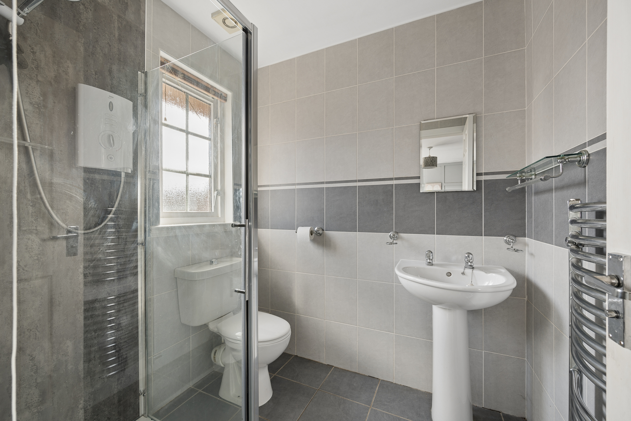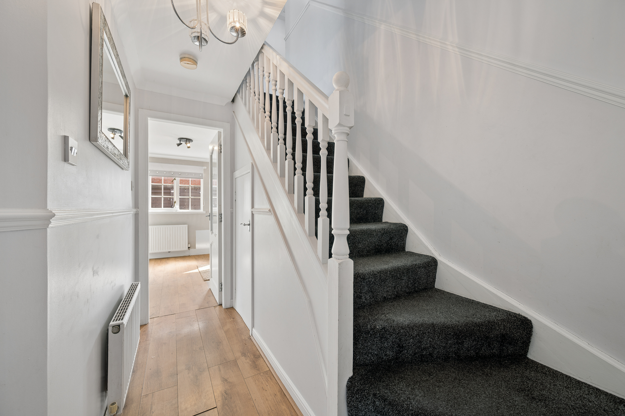 Upstairs, the landing leads to three well proportioned bedrooms. The principal bedroom is a beautifully presented retreat, complete with fitted mirrored wardrobes, soft neutral tones, plush carpeting and a modern en-suite shower room finished with contemporary tiling.