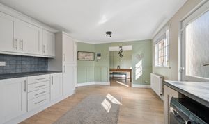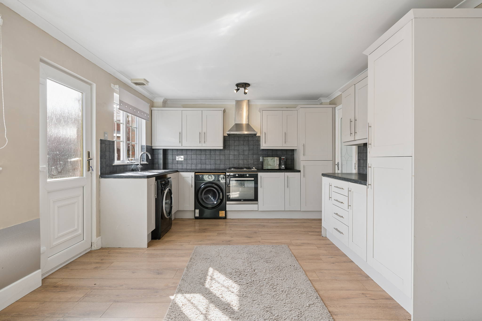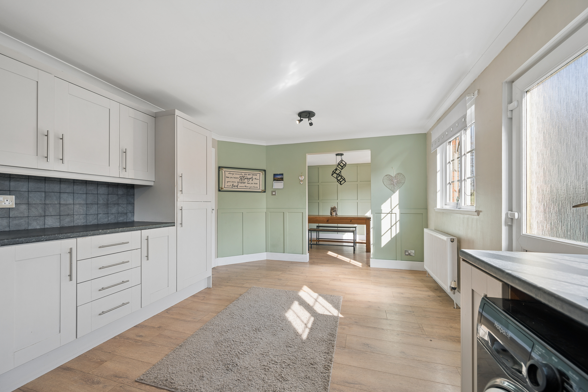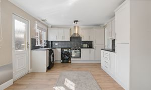 Moving through, you are led into the open plan kitchen and dining area which forms the heart of the home. The kitchen is fitted with modern grey shaker style cabinets, paired with contrasting dark worktops and a tiled splashback, offering both practicality and a timeless finish. There is ample storage and workspace, along with room for freestanding appliances.