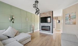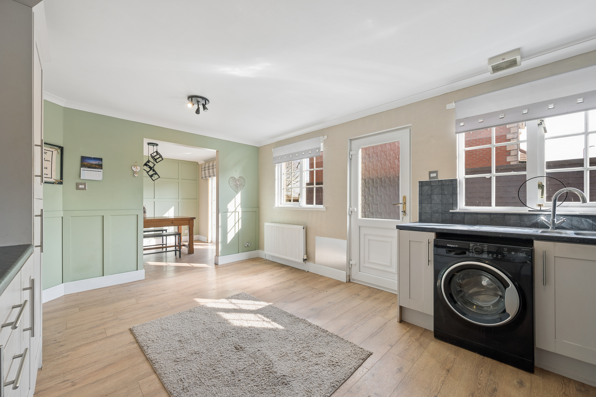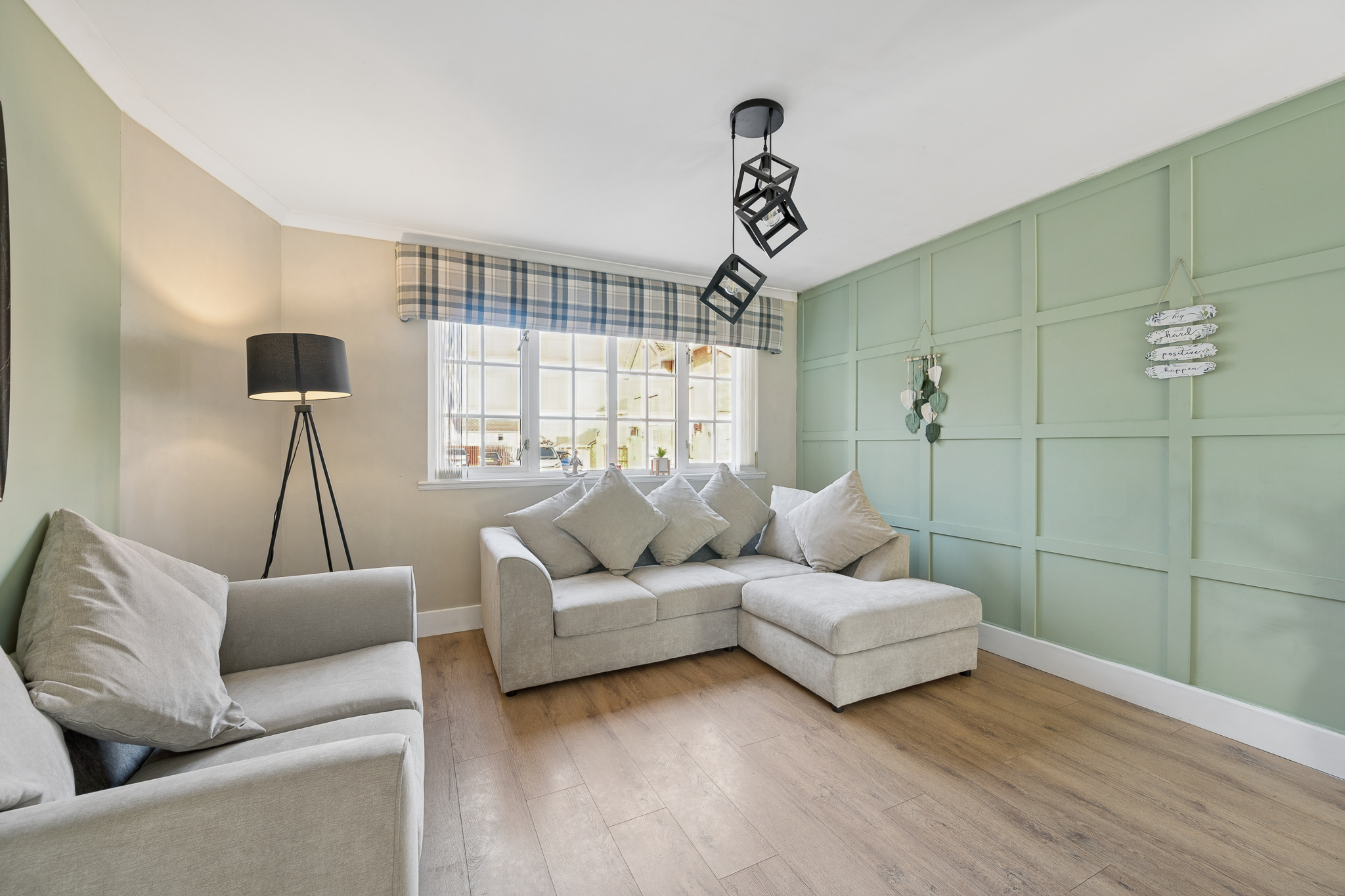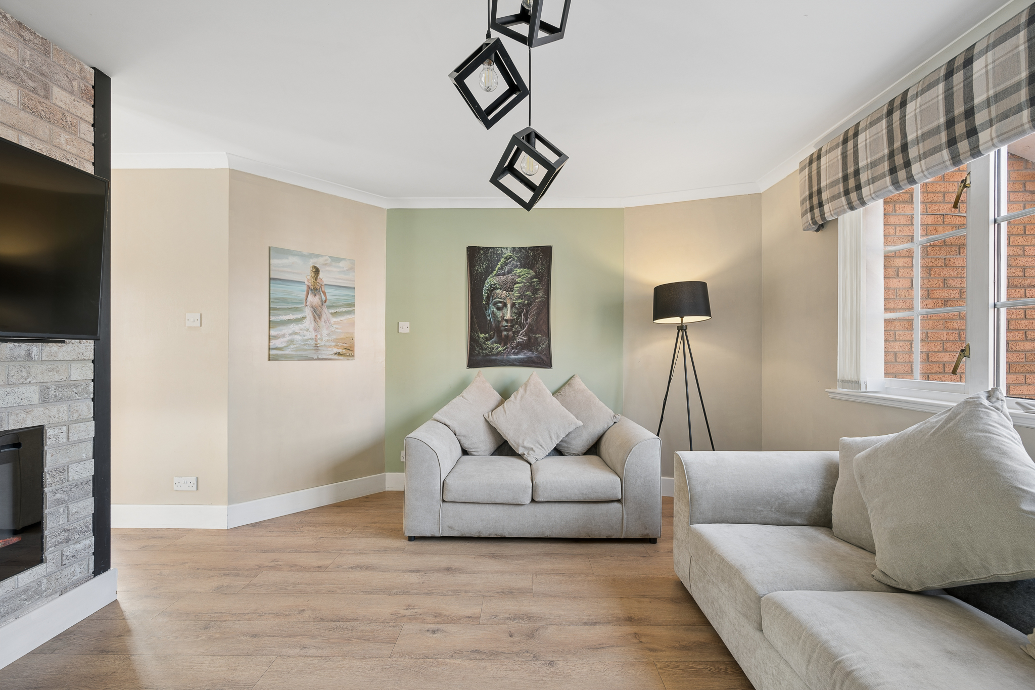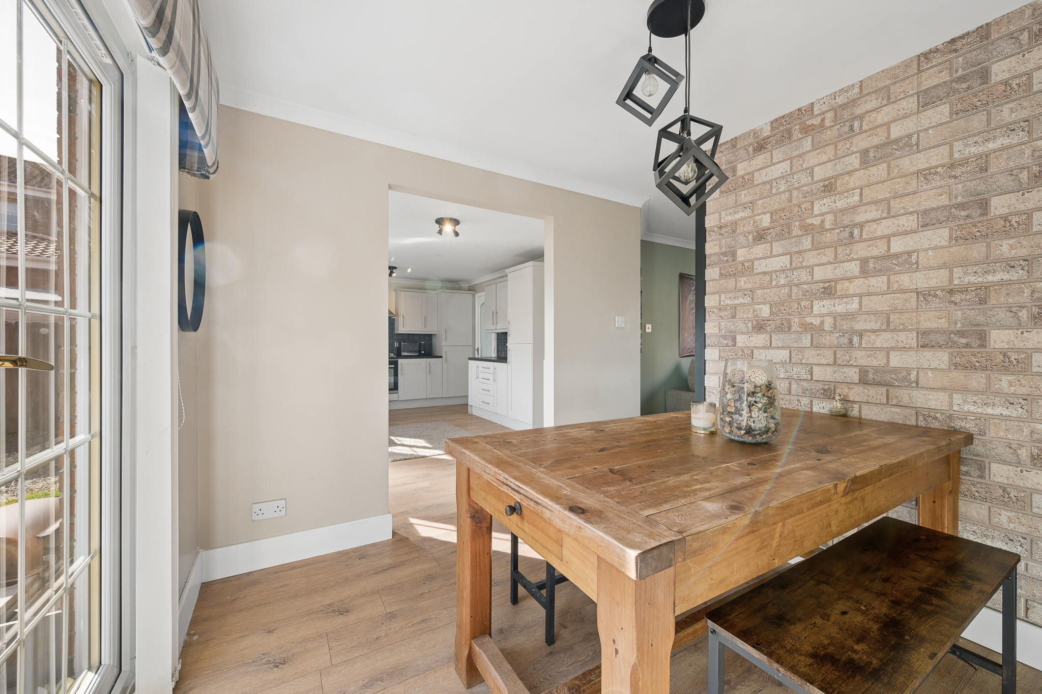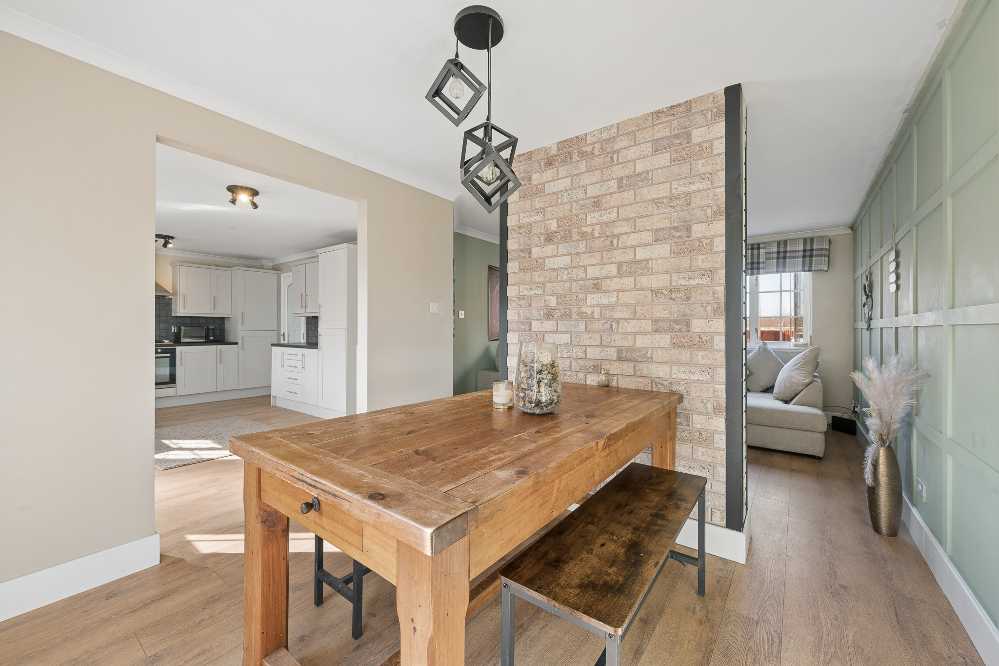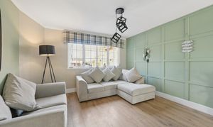 From the dining area, you then enter the spacious lounge, creating a natural flow through the home. This relaxing yet contemporary living space is enhanced by a striking sage green panelled wall, adding depth and character, complemented by modern wood effect flooring. A stylish media wall with inset fireplace and brick effect surround creates a focal point, while large windows allow natural light to flood the room.