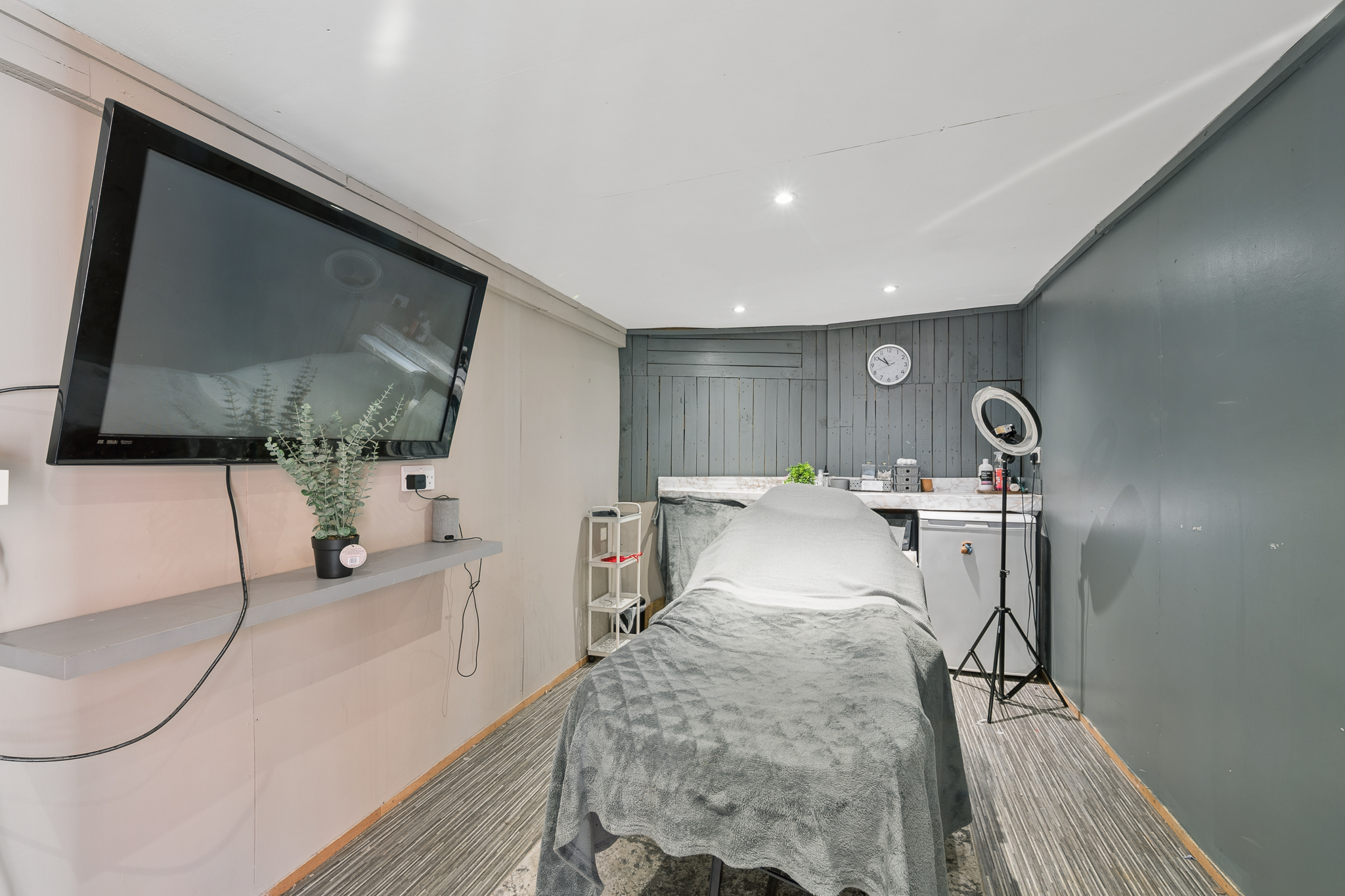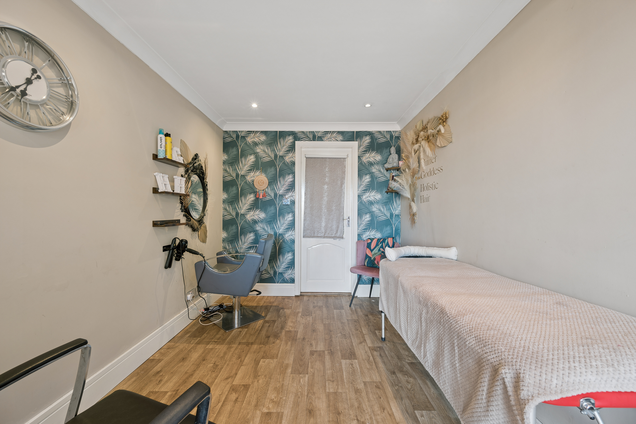 A particularly unique feature is the substantial outbuilding, cleverly split into two functional spaces. One side provides excellent storage for bikes and outdoor equipment, while the other has been fully converted into a beauty salon, finished in a modern style and perfectly suited for business use or a private treatment space.
