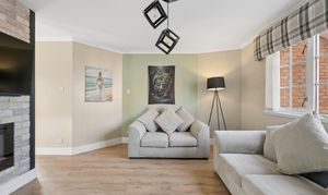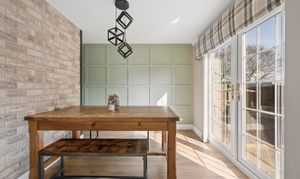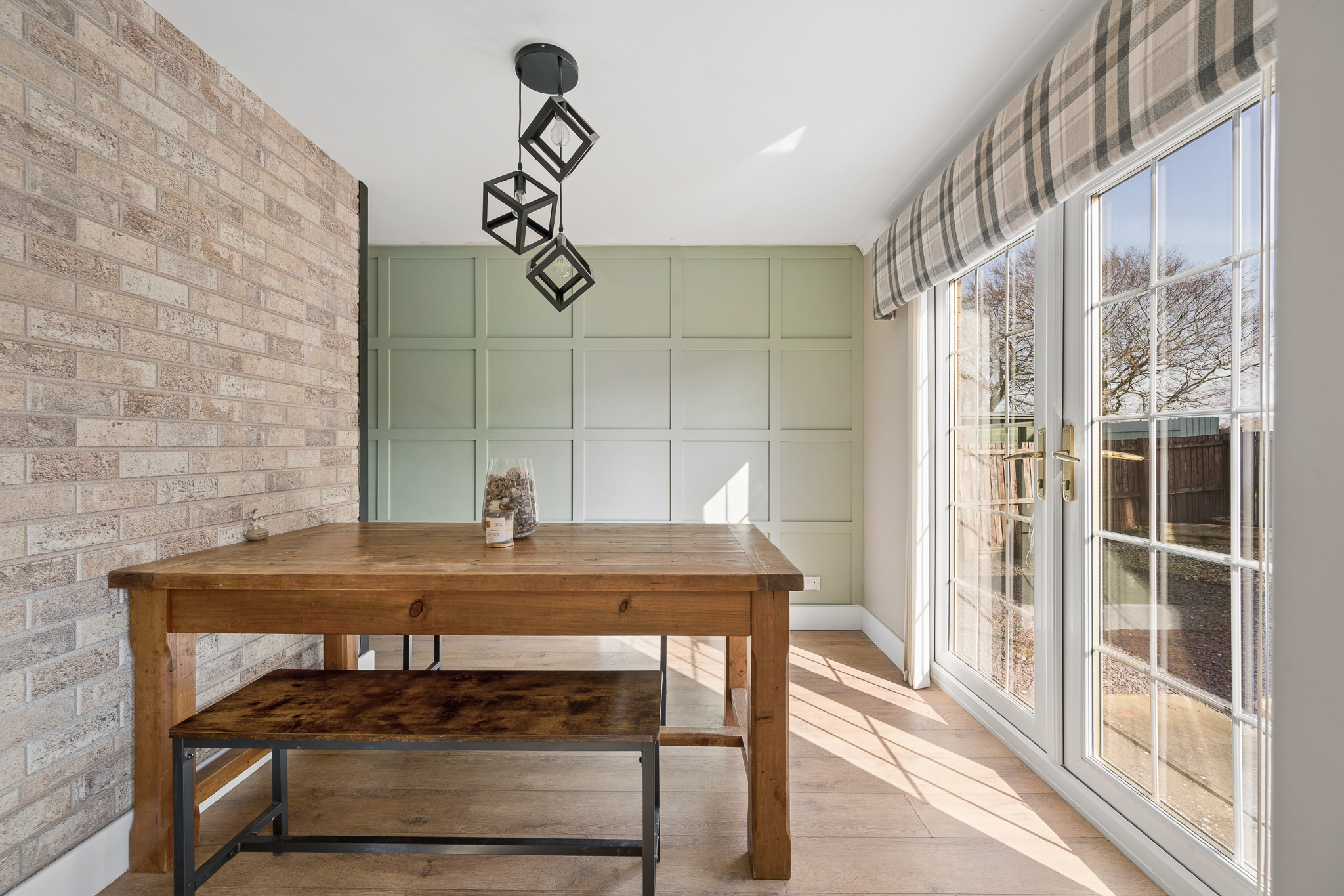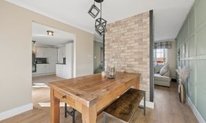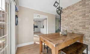 The dining area is equally impressive, featuring continued panel detailing and a feature brick style wall, creating a warm and stylish setting for entertaining. French doors open directly onto the garden, allowing for effortless indoor outdoor living.