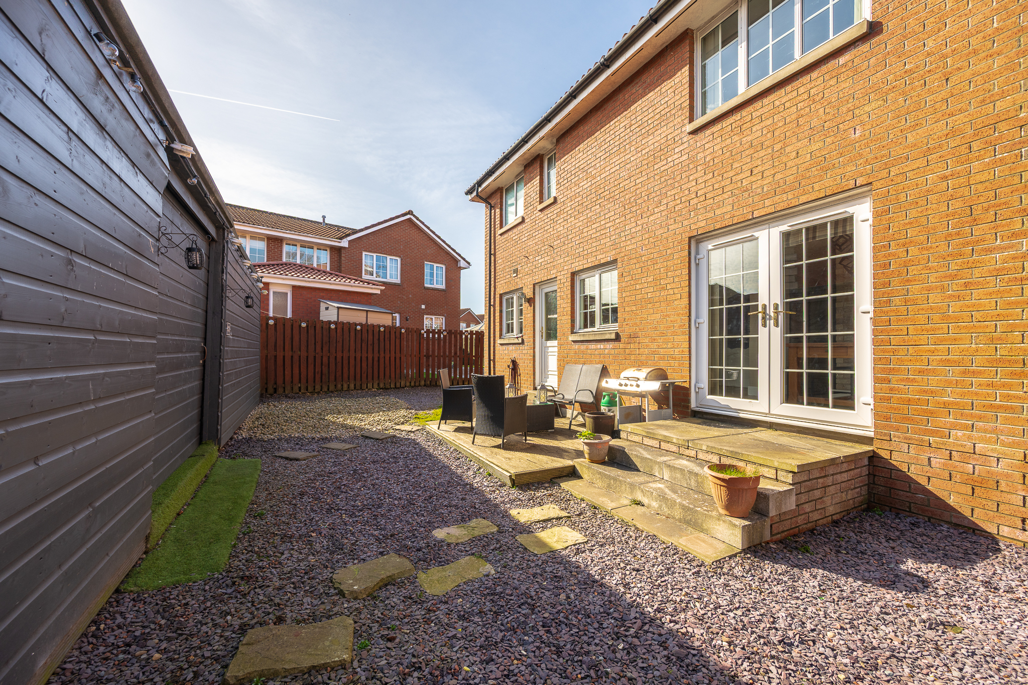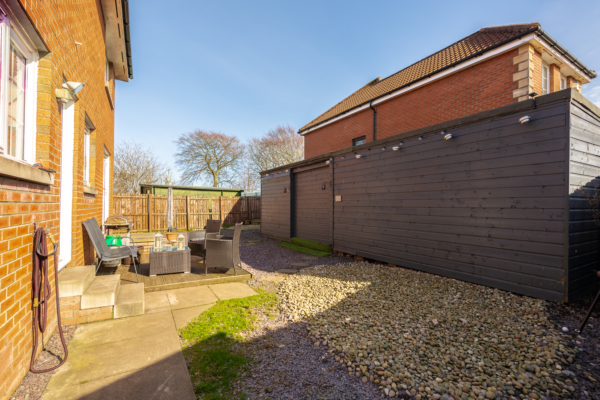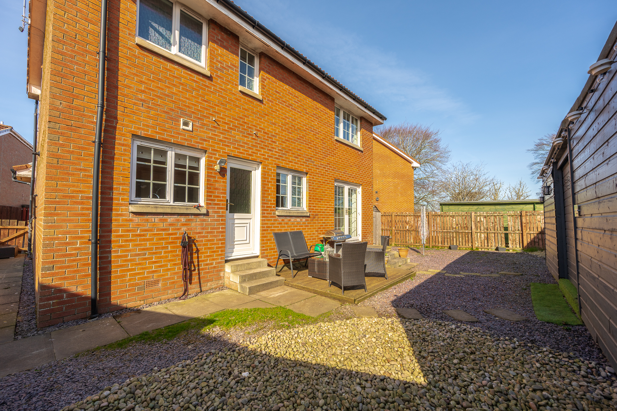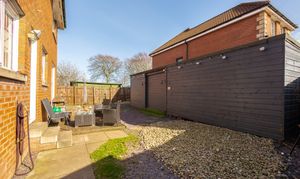 Externally, the rear garden has been designed with low maintenance in mind, featuring a combination of patio and decorative stone. Benefitting from a desirable south east facing aspect, the garden enjoys an abundance of natural sunlight throughout the day, making it an ideal space for relaxing or entertaining.