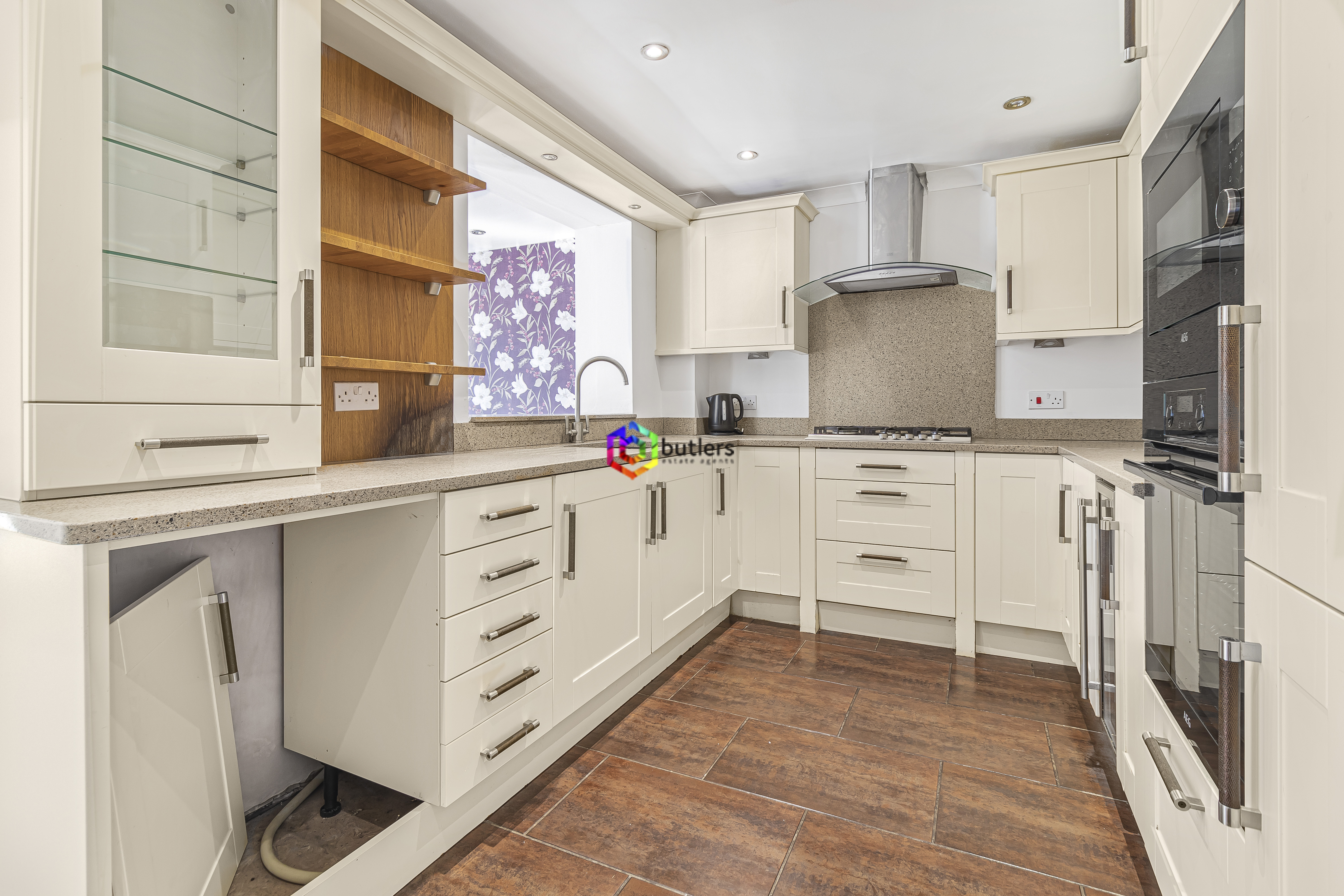 An ivory shaker-style kitchen with a black single electric oven and microwave above. There are integrated appliances of a fridge, freezer and dishwasher. The five-burner hob has an extractor above and there is under-counter space for a washing machine. It is a great chef area with granite work surfaces and an opening to the extension allowing for family and guests to involve the chef in conversation.