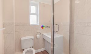 Accessed from Bedroom Two there is a shower cubicle, white wash hand basin on a vanity unit and a white WC.