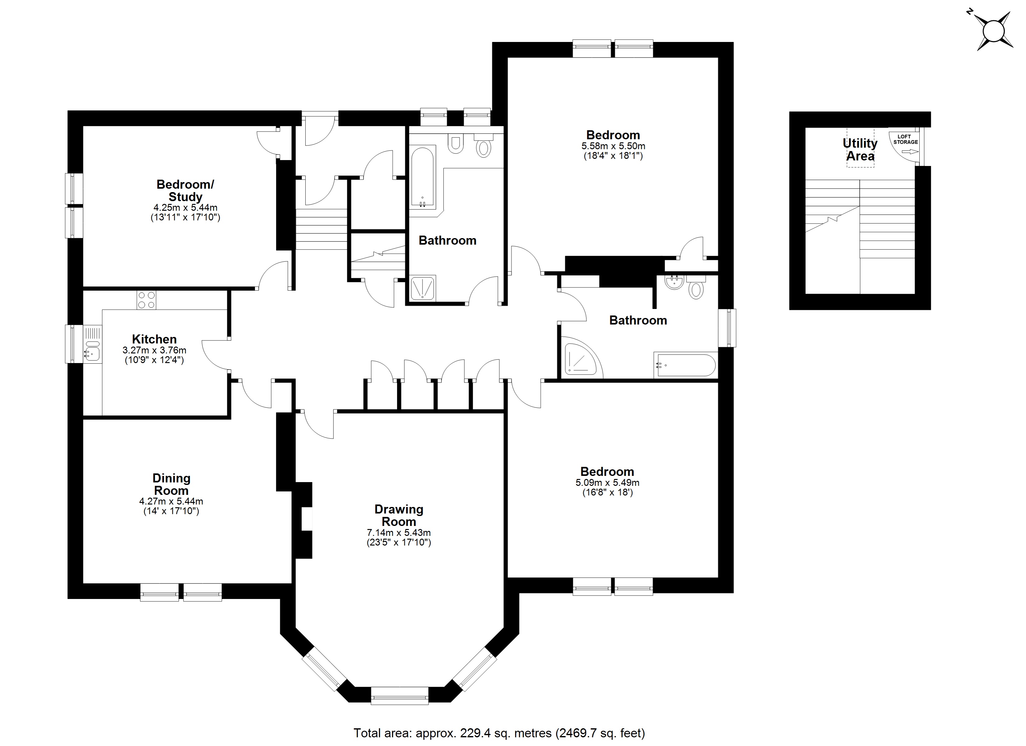 Private Entrance Hall and Cloakroom | Central Hallway | Drawing Room | Dining Room | Kitchen | Three Bedrooms (one currently arranged as a study) | Two Bathrooms | Utility Area/Loft Storage