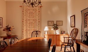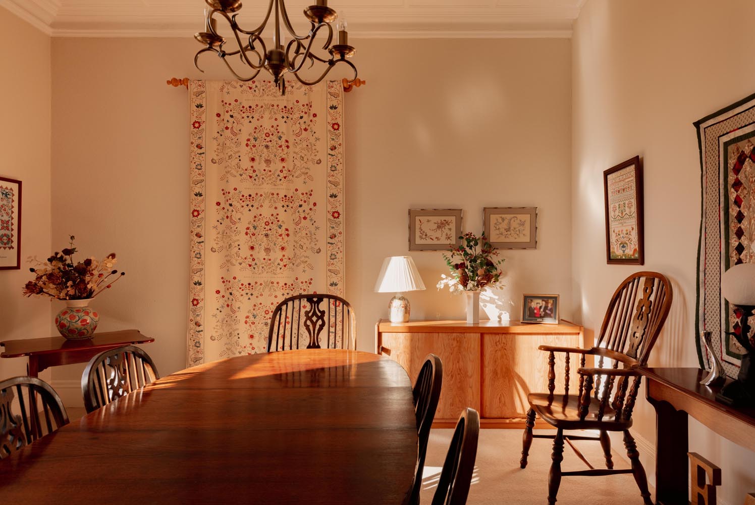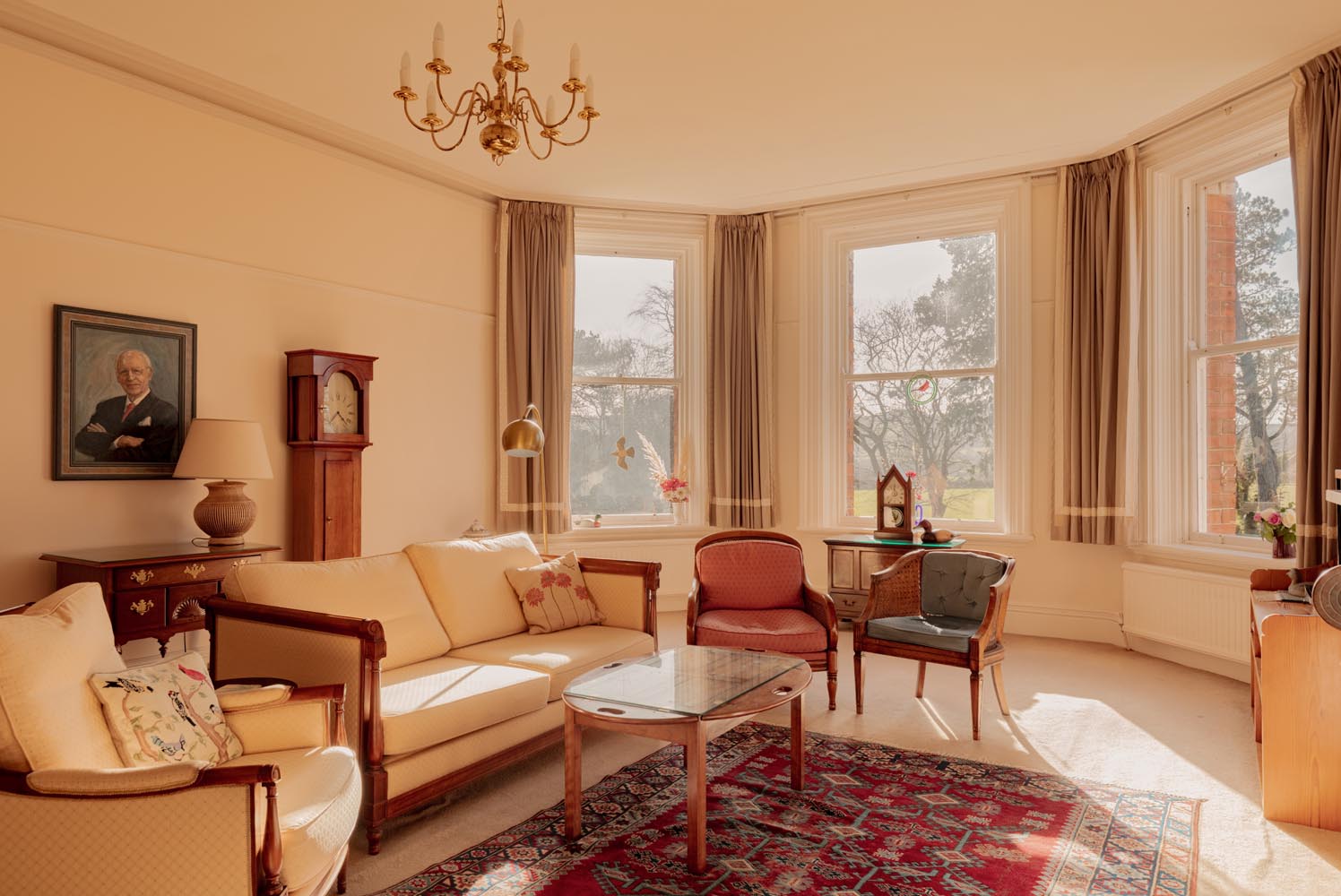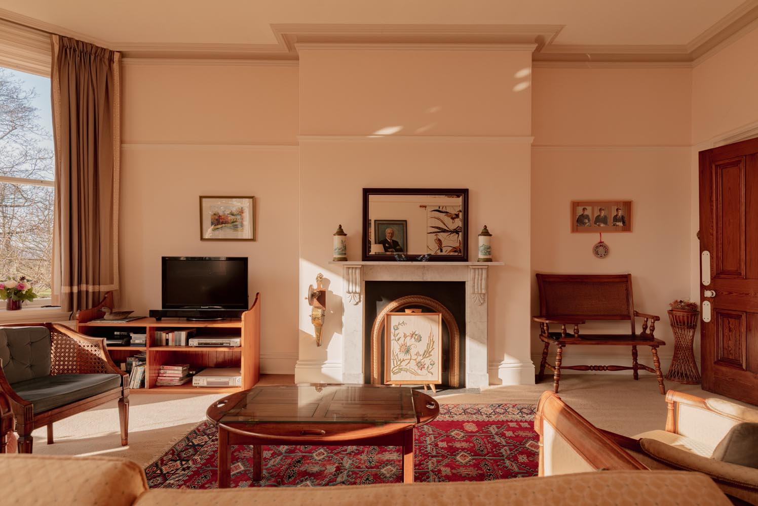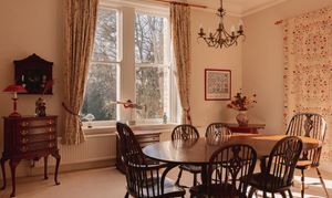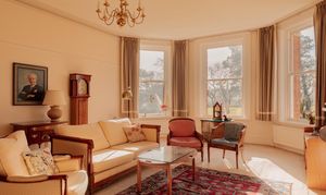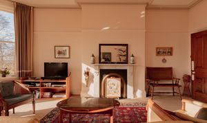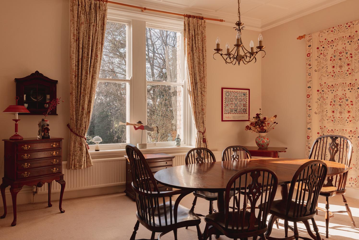 The principal reception rooms sit to the south, where tall sash windows flood the interiors with natural light and frame open views across the communal gardens and the wooded Tyne Valley beyond. The drawing room is particularly impressive, centred around a deep bay window that draws the eye outward, with high ceilings, elegant proportions and a period fireplace forming a calm and composed living space equally suited to everyday use or entertaining. Across the hall, the dining room mirrors this sense of balance and scale, enjoying the same outlook and offering a refined setting for more formal occasions.