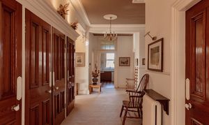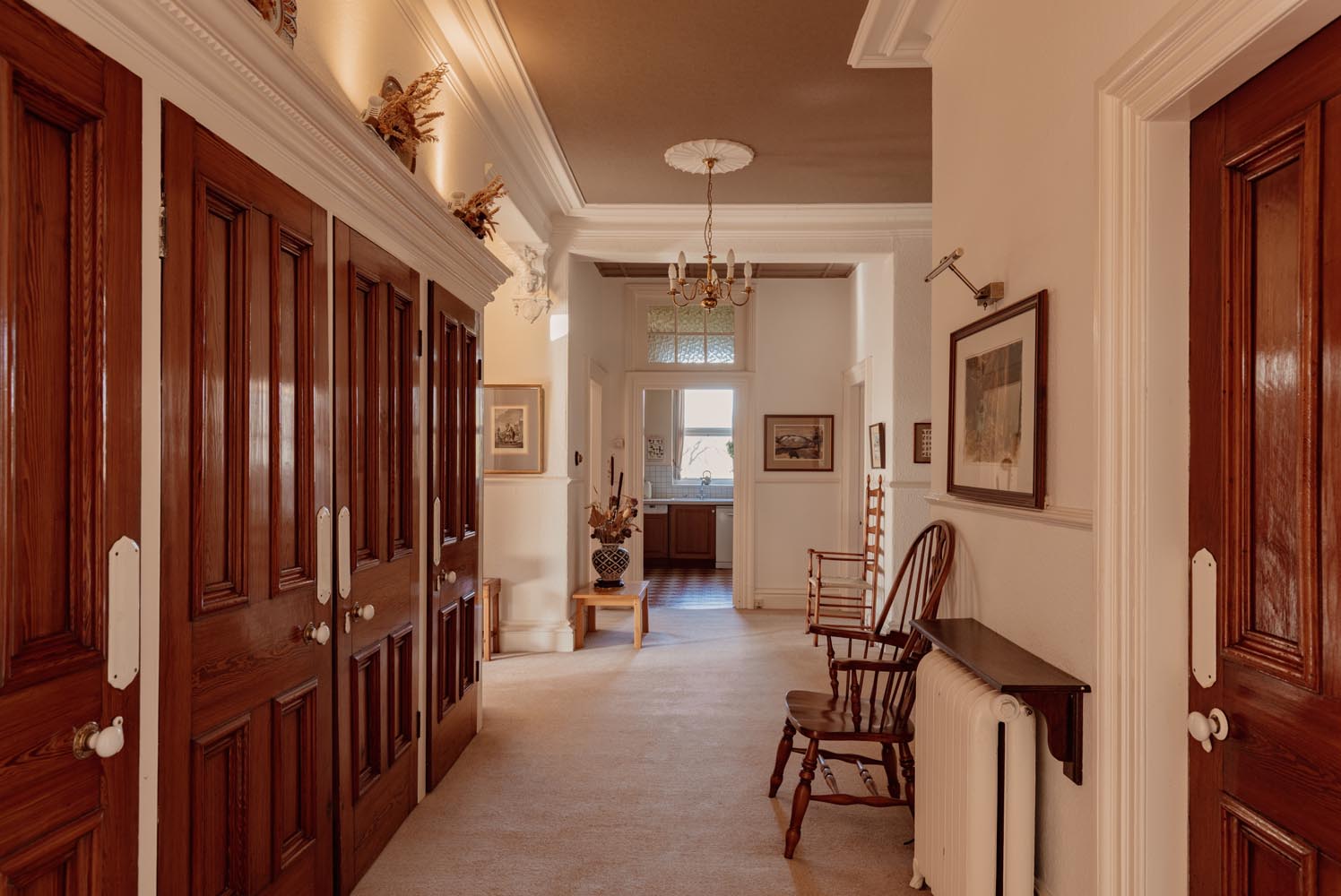 Arrival is through a handsome communal entrance hall, where original memorials and a broad staircase rise to the first floor. The apartment itself is accessed via a private entrance hall with cloakroom, creating an immediate sense of separation and security. Beyond, a wide central hallway unfolds, its scale and ceiling height immediately apparent, with ornate cornicing, decorative corbels and original Victorian pine cupboards providing both character and excellent storage.