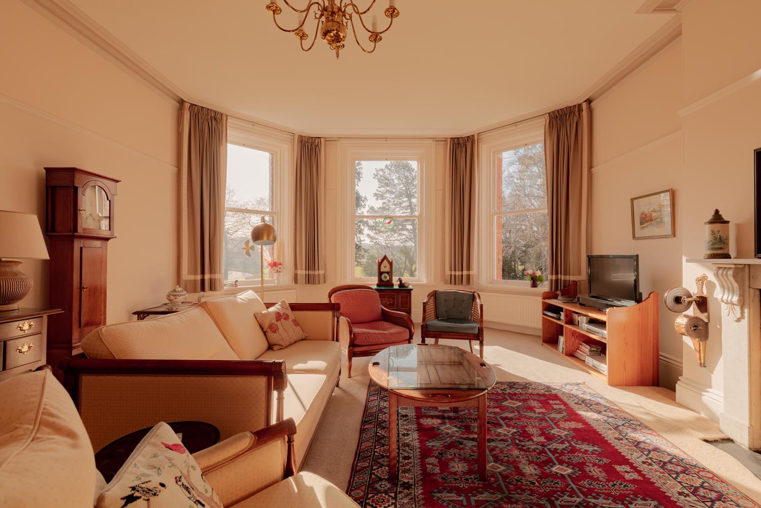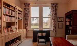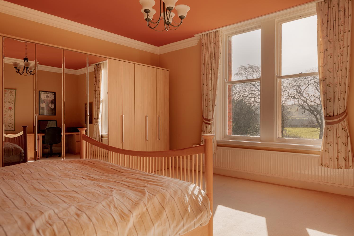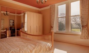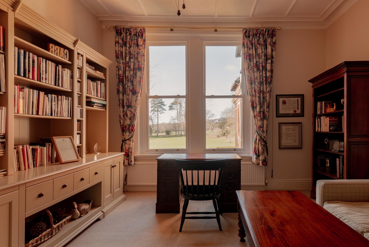 There are three bedrooms in total, all generously proportioned and thoughtfully arranged. One is currently used as a study, fitted with bespoke bookcases and cabinetry designed to complement the period features, while the two principal bedrooms enjoy particularly fine outlooks across the gardens and valley. The rooms are calm and restful, with tall sash windows, soundproofed detailing where appropriate and a consistency of scale that is increasingly rare.