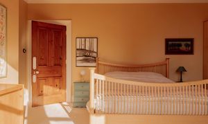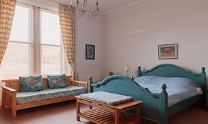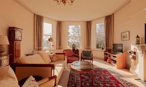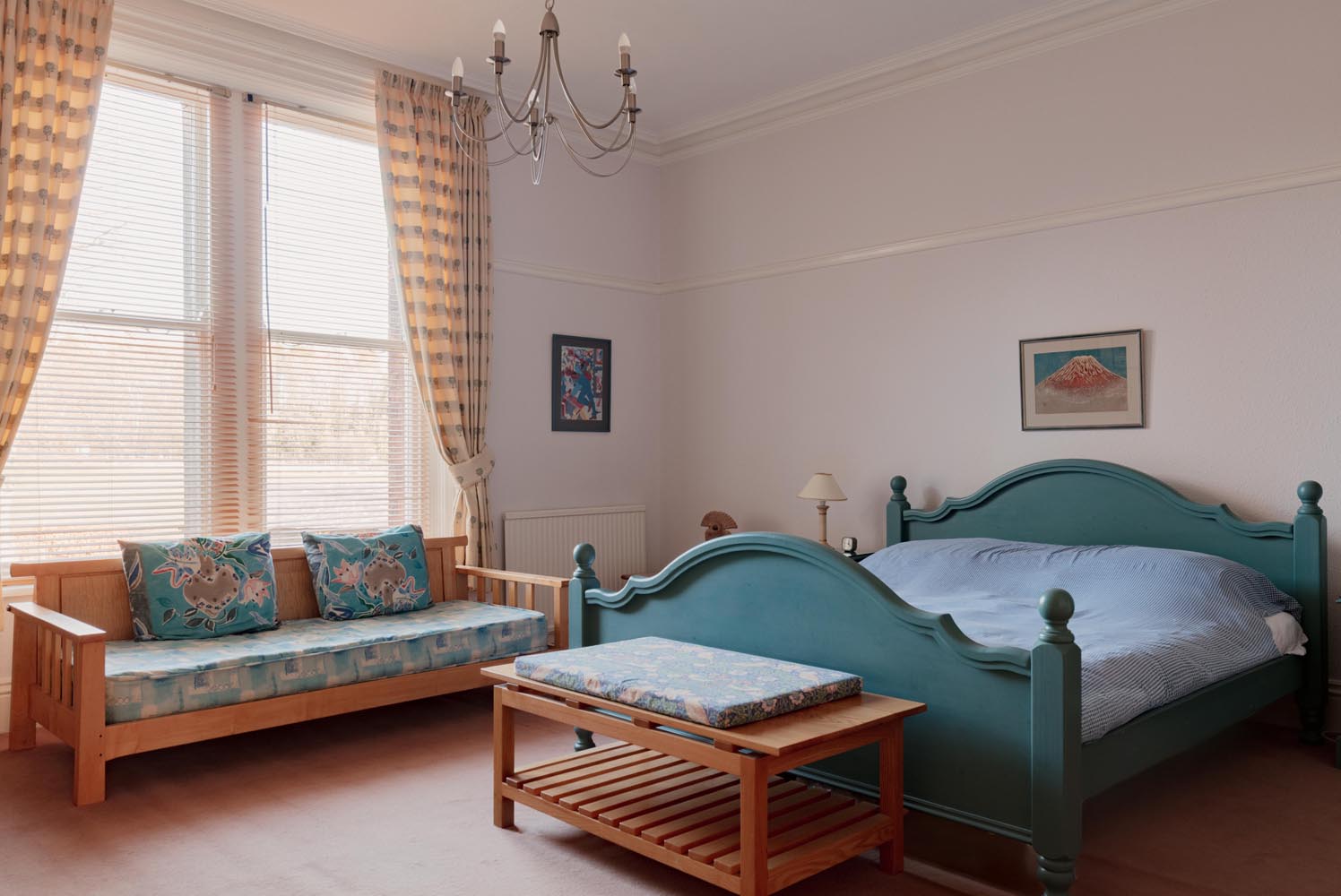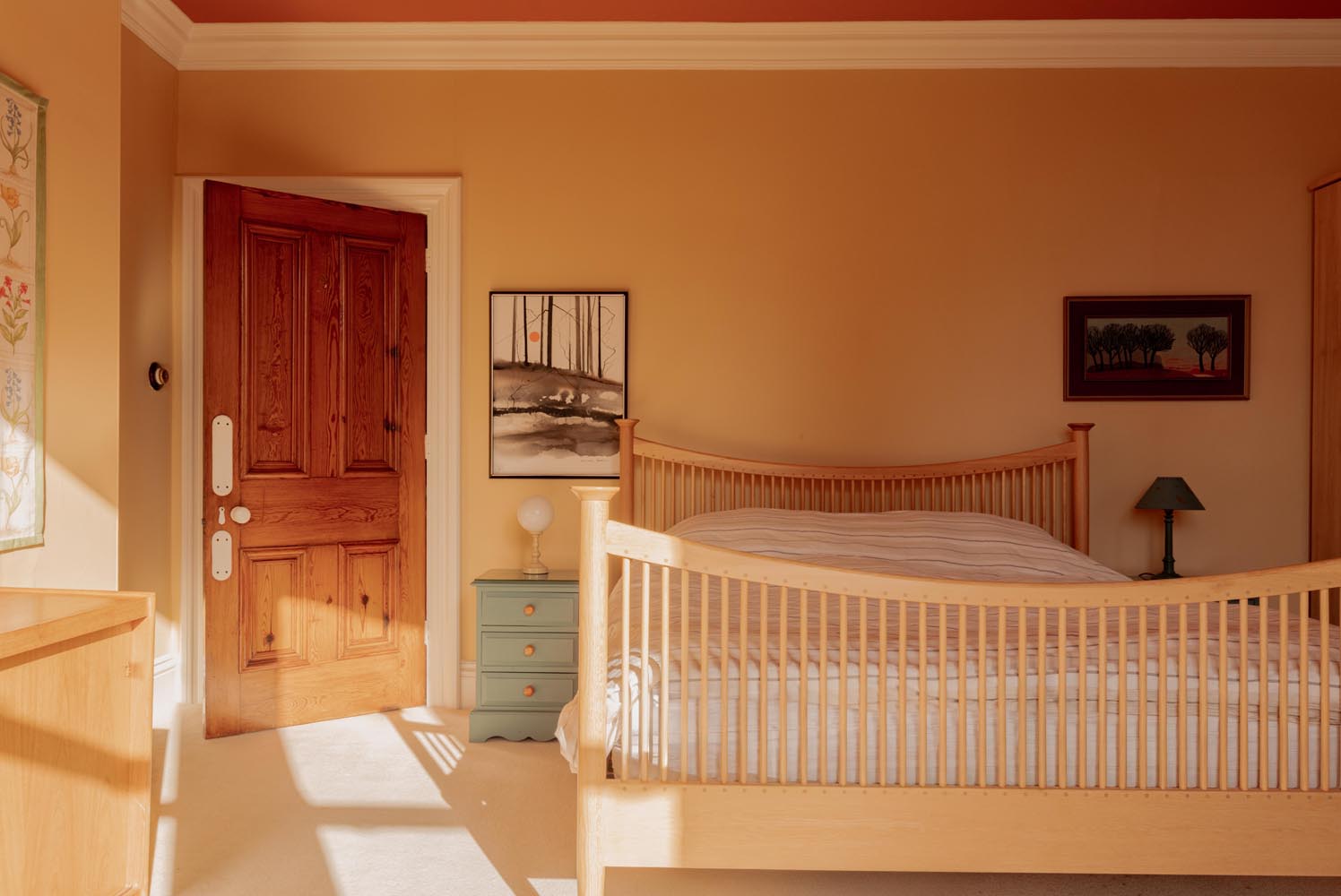There are three bedrooms in total, all generously proportioned and thoughtfully arranged. One is currently used as a study, fitted with bespoke bookcases and cabinetry designed to complement the period features, while the two principal bedrooms enjoy particularly fine outlooks across the gardens and valley. The rooms are calm and restful, with tall sash windows, soundproofed detailing where appropriate and a consistency of scale that is increasingly rare.