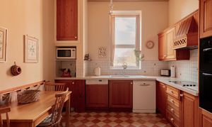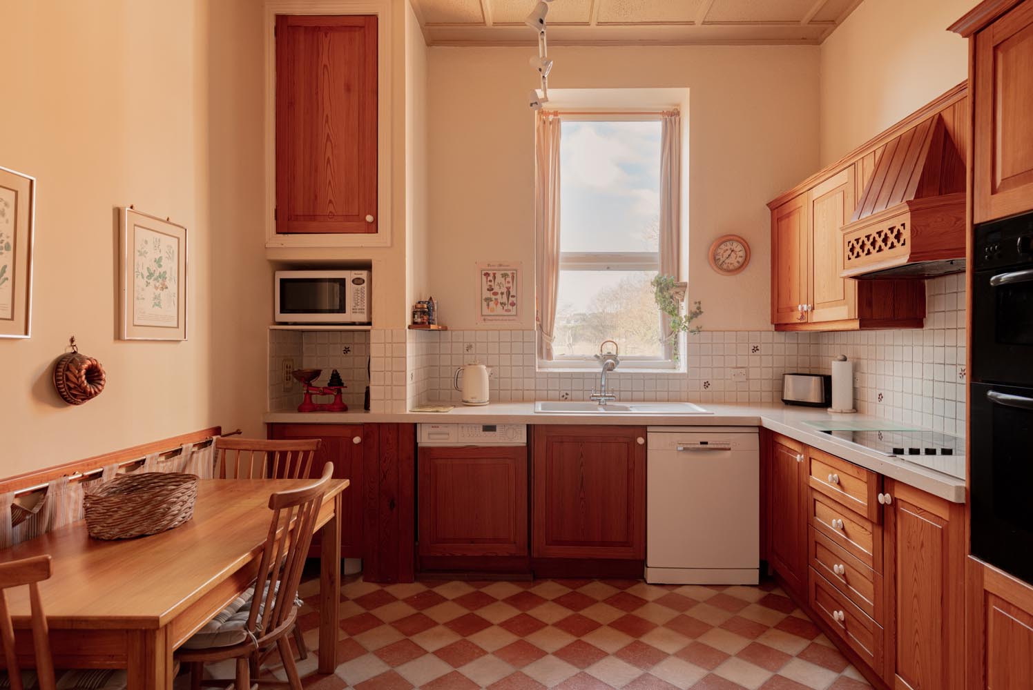 The kitchen is arranged separately, overlooking Corchester Fields, once the playing grounds of the former school and now open parkland. Fitted with solid timber cabinetry, double oven, electric hob and integrated appliances, it is a practical and well organised space, with room for a breakfast table and chairs beneath high ceilings that reinforce the apartment’s sense of volume and light.