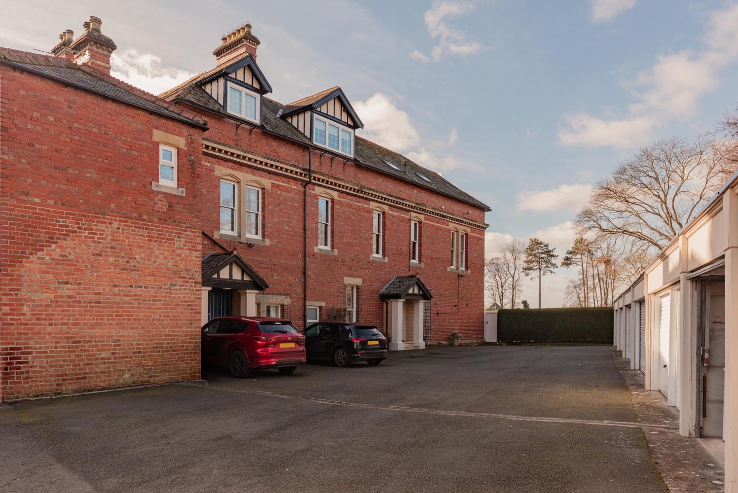 The apartment is set within well maintained communal gardens, defined by mature pine and deciduous trees, open lawns and a strong sense of privacy. South facing aspects ensure excellent natural light throughout the day, with uninterrupted views across surrounding fields and woodland. A double garage, cabled for electric vehicle charging, provides secure parking and storage, complemented by forecourt parking for additional vehicles and visitors. From the garage area, there is direct access onto CorchesterFields, placing countryside walks quite literally on the doorstep while retaining a peaceful and discreet setting just moments from the heart of Corbridge.