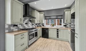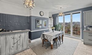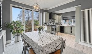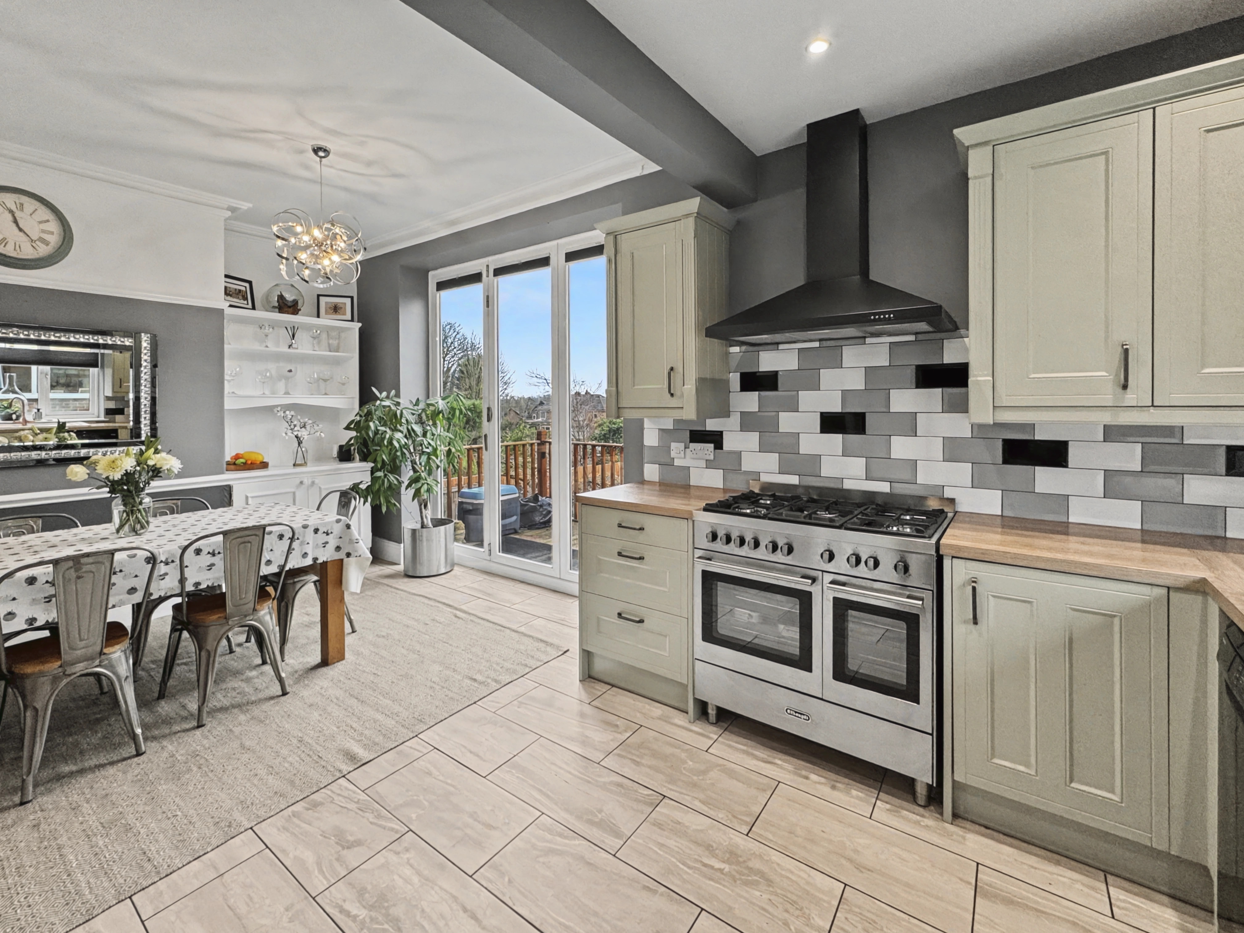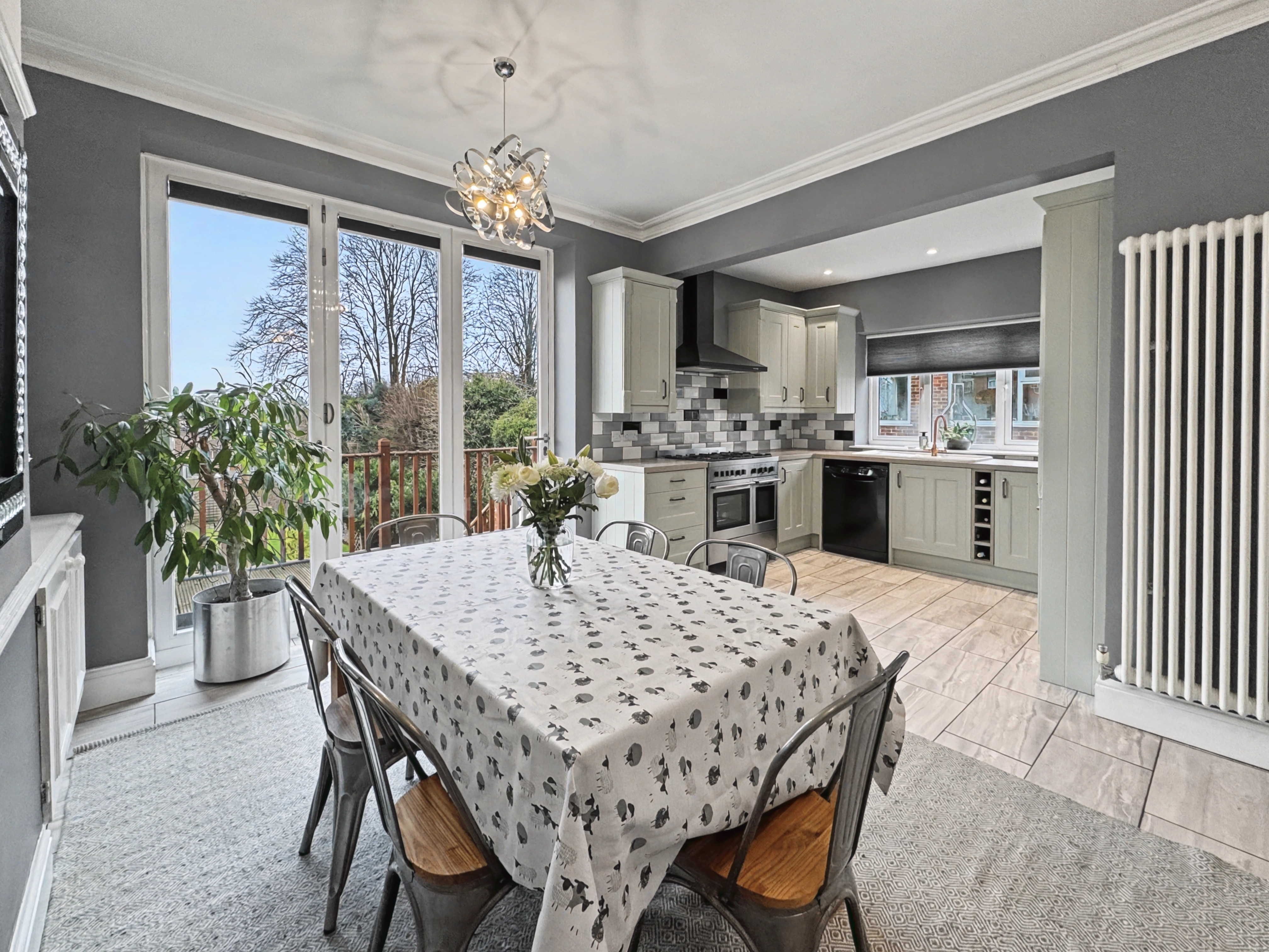 To the rear of the property is a dining room with glazed doors that open out to a small decked area with steps leading down to the garden. The kitchen offers a host of wall and base units with beech wood-effect worktops and a tiled splashback. There is extensive storage and generous workspace, all overlooking the enchanting gardens. The added benefit of a dining area provides a seamless transition from cooking to dining, making it ideal for both casual meals and formal gatherings. The open-concept layout effortlessly merges the dining and kitchen areas, creating a cosy and contemporary ambience.