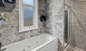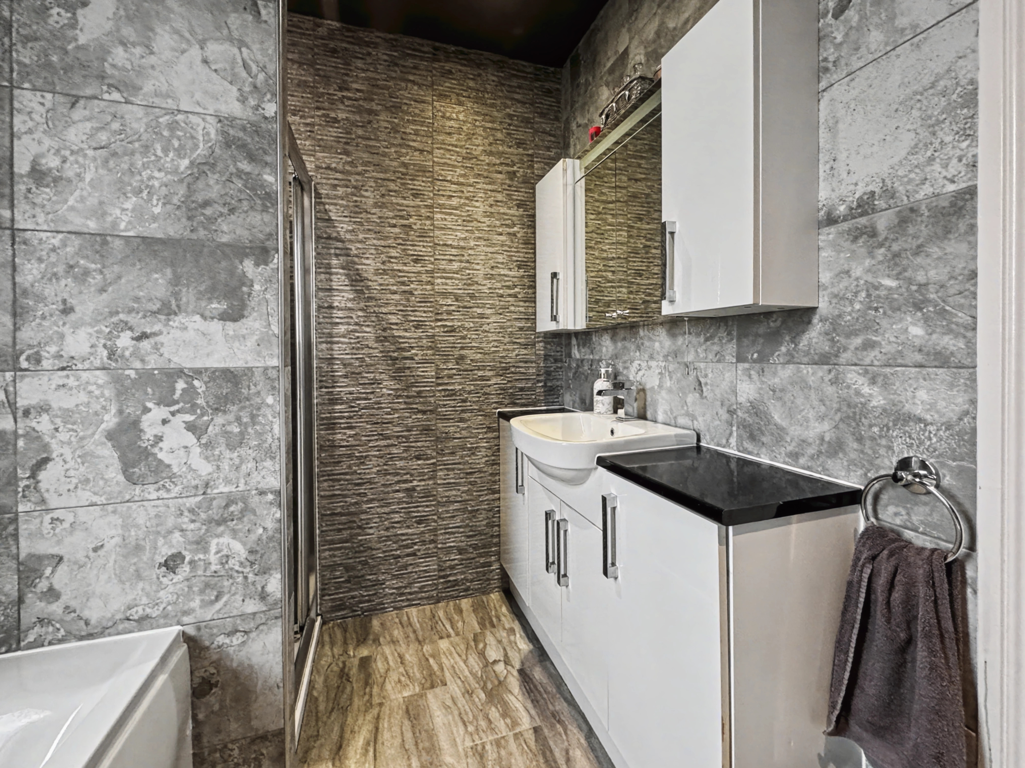 The fully tiled family bathroom features a contemporary white three-piece suite, thoughtfully designed with tiled floors and complementary wall tiles, complete with a sleek bathtub and separate enclosed shower, vanity sink and heated towel radiator. There is also a separate WC.