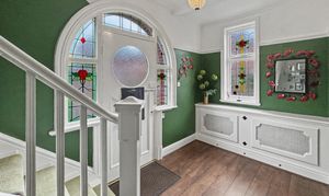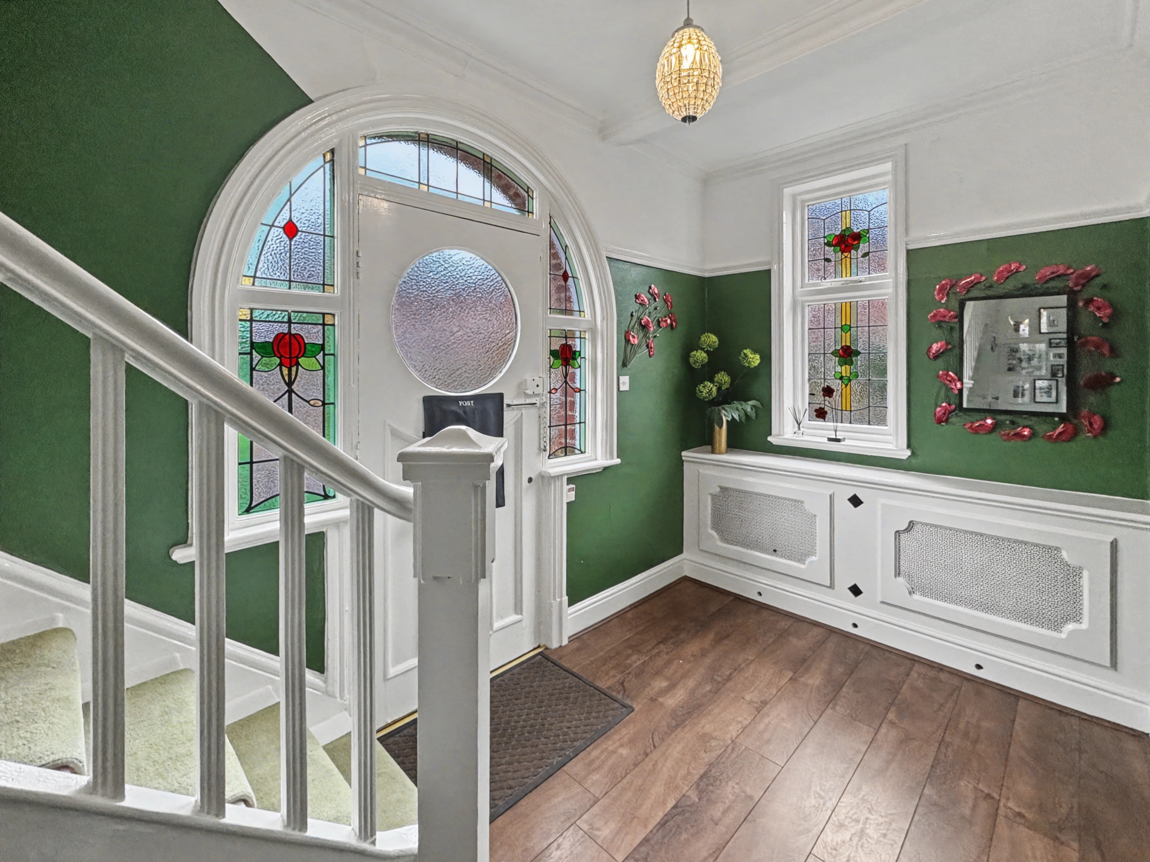 As you enter the property into a bright and welcoming hallway with a grand staircase, you immediately sense the tone of this beautifully presented home. Off the hallway is an impressive reception room, which exudes its own unique charm, showcasing a fireplace and an abundance of original features. The expansive bay windows flood the space with natural light, illuminating the grandeur of the interiors.