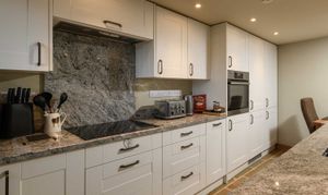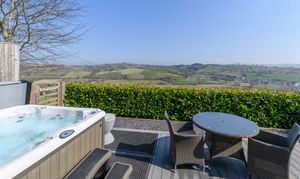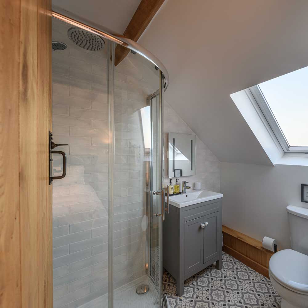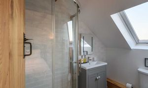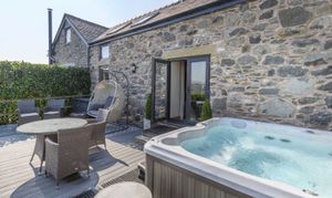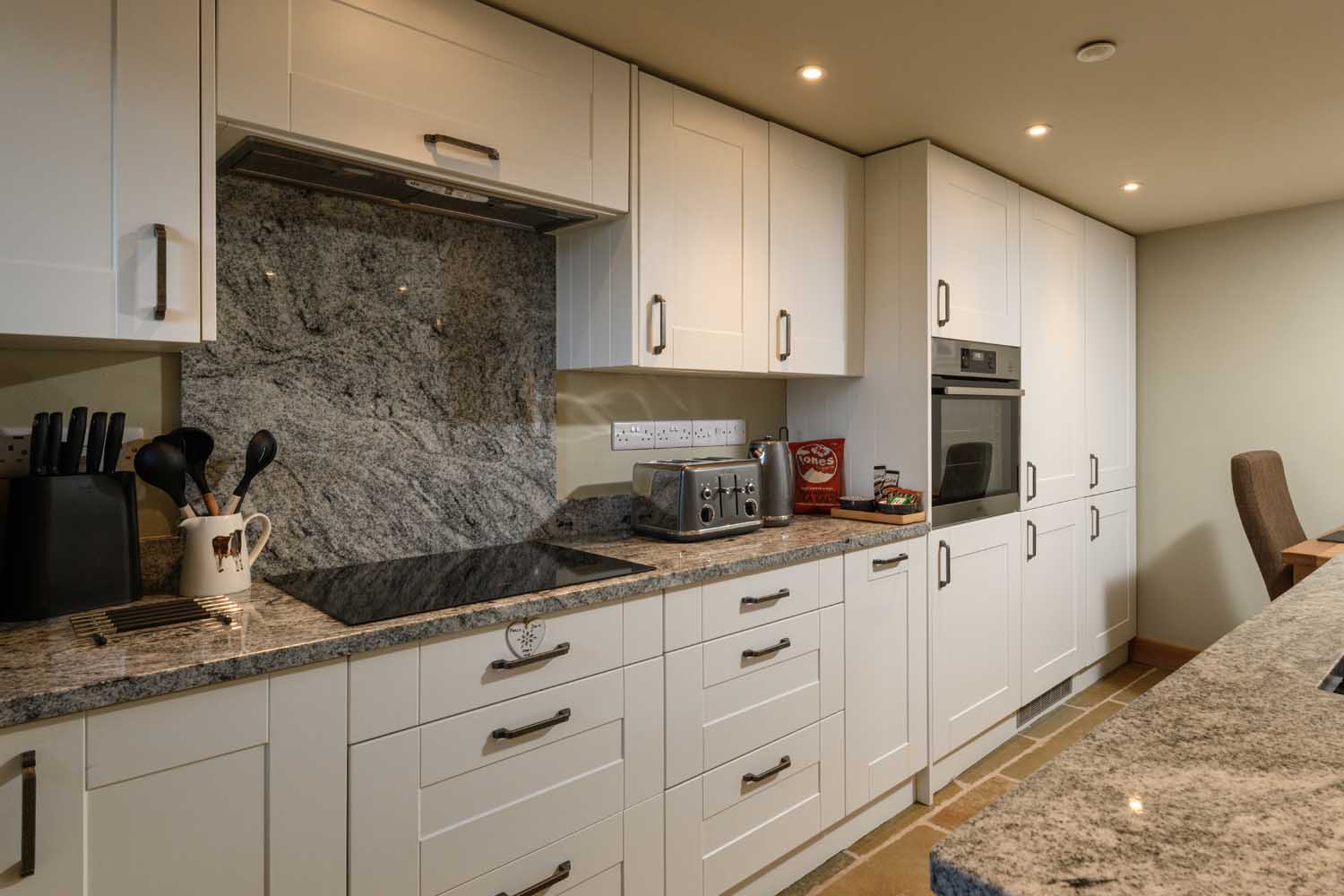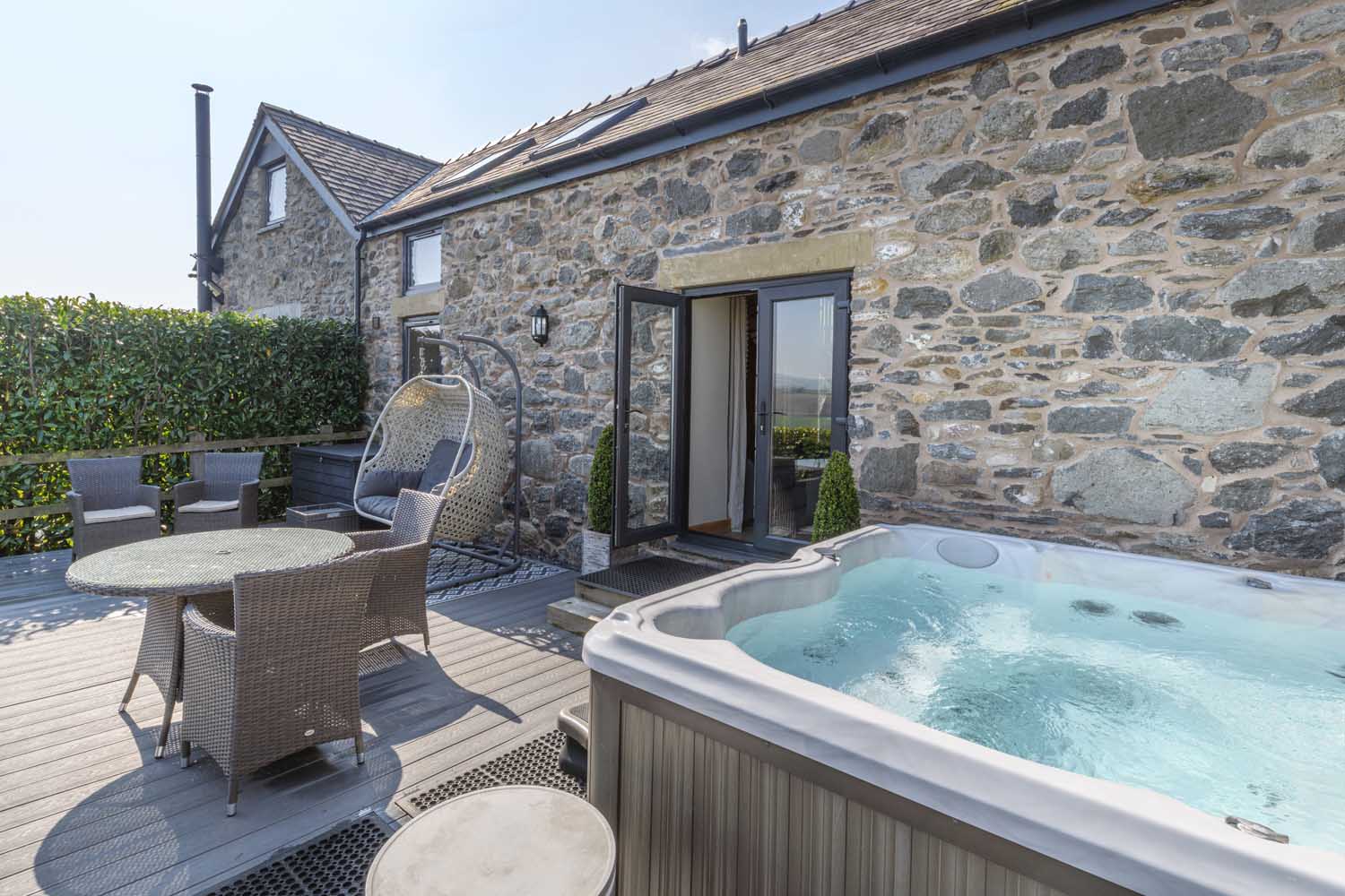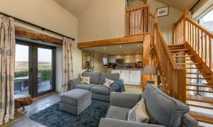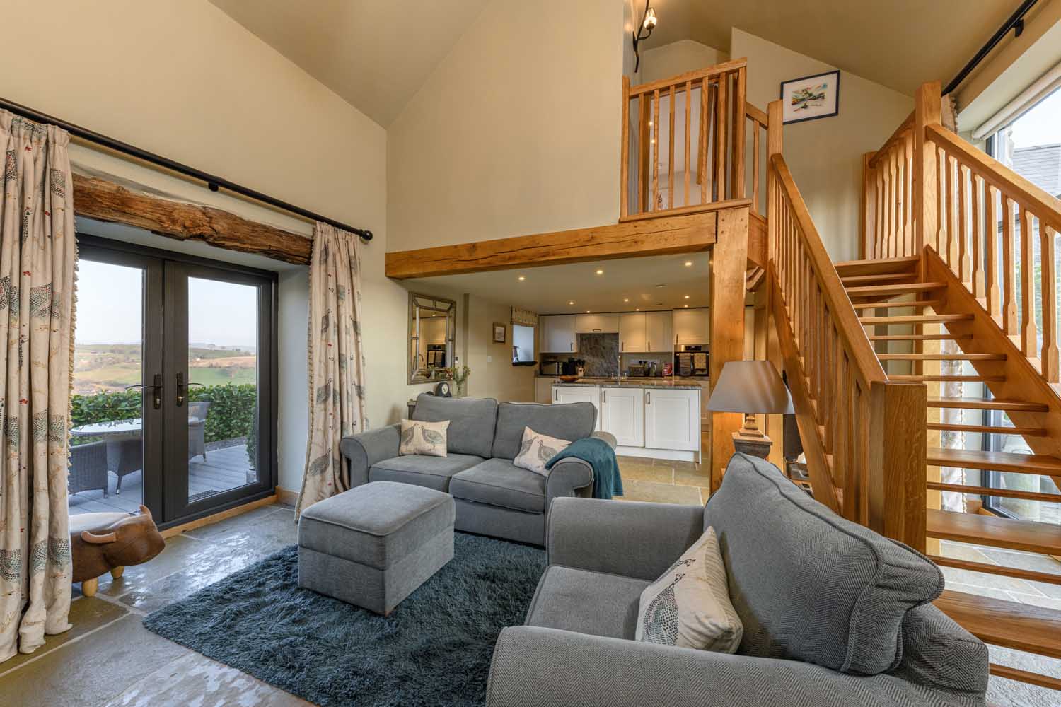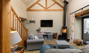 The Shippon is a one-bedroom cottage with a striking open-plan living space, vaulted ceiling, and full-height glazing that draws in light throughout the day. A well-fitted kitchen, dining area, and log-burning stove make it a popular year-round retreat, with an en suite bedroom tucked beneath the eaves and a hot tub set just outside.