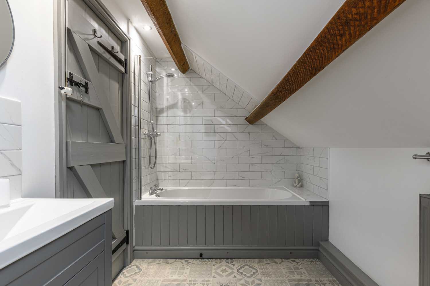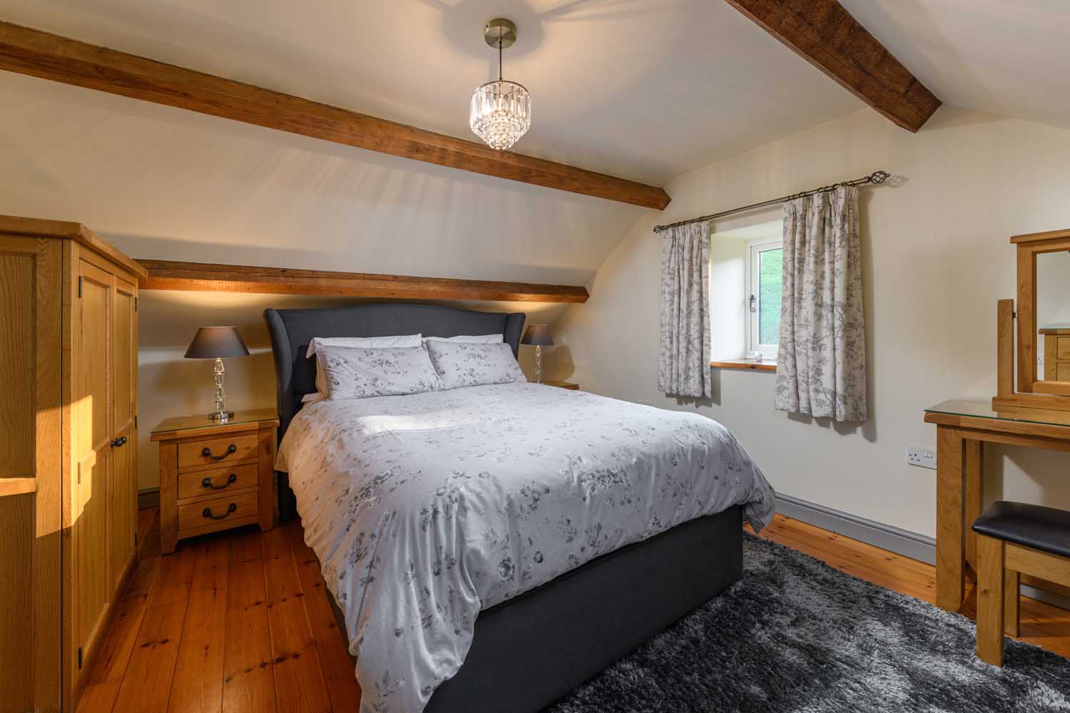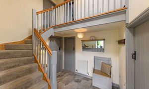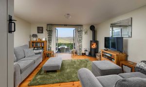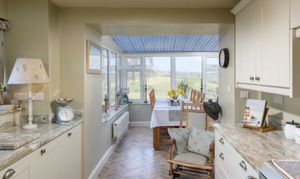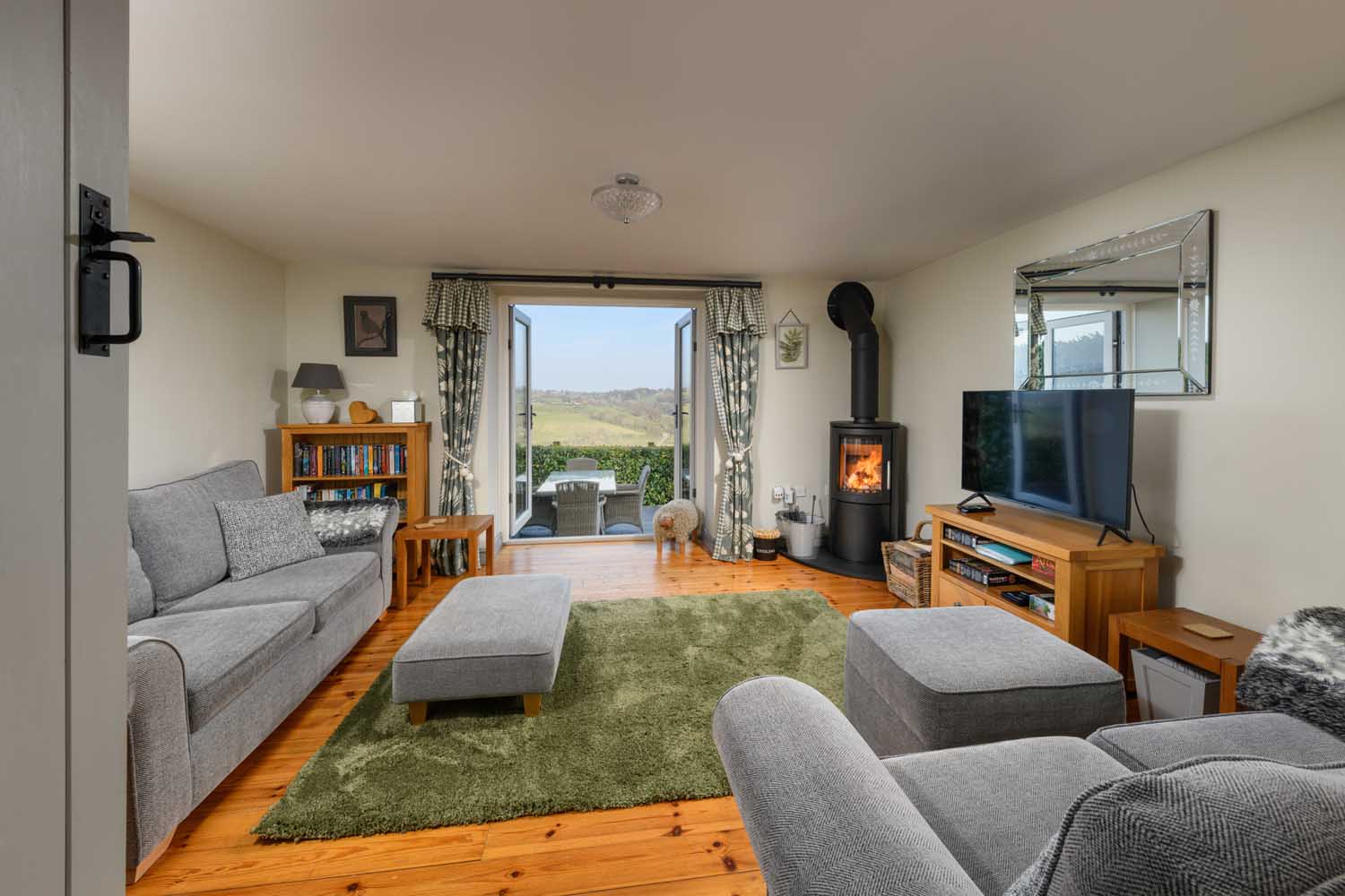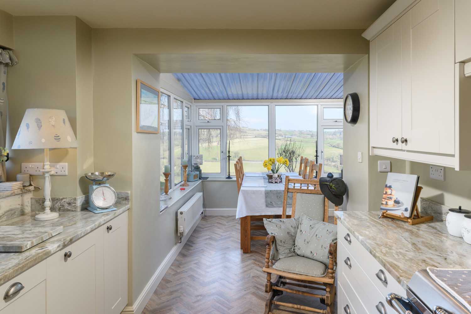 At its heart is a long, light-filled kitchen with polished granite worktops, an Everhot stove and views over the valley. The adjoining garden room works naturally as a dining space, drawing in light from three sides. Two reception rooms offer distinct atmospheres: one with a rustic edge—timber ceiling beams and a log-burning stove set beneath the stairs; the other more pared-back, with a deep bay window seat and gentle detailing. Upstairs, four bedrooms continue the home’s simple palette and country character, served by two well-finished bathrooms, including a cast-iron roll-top bath and separate walk-in shower.