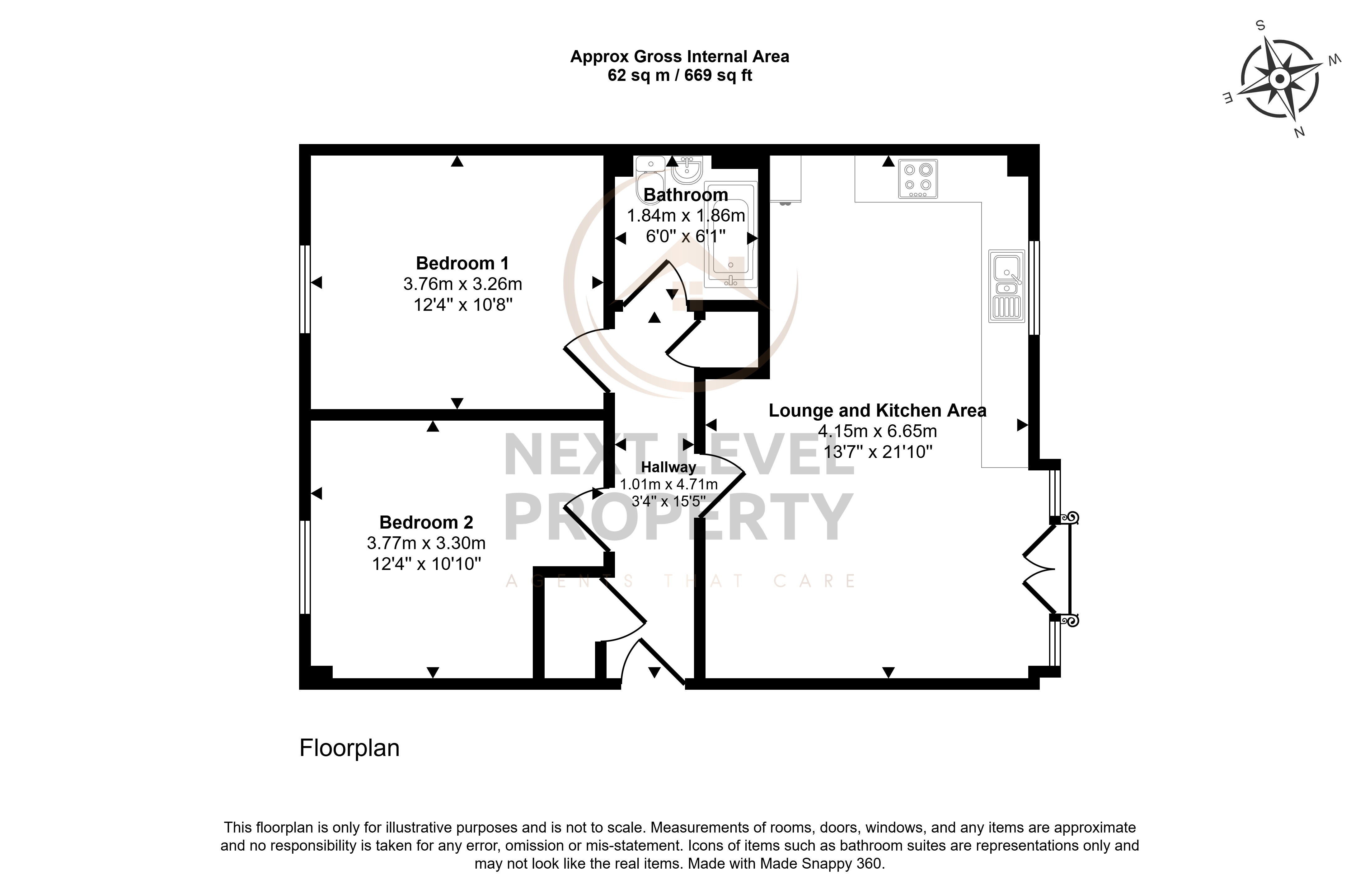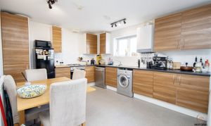 At the heart of the apartment is a spacious open-plan kitchen, dining, and living area that feels instantly inviting. The kitchen is fitted with a sleek range of modern units and quality appliances, including a single electric oven, four-ring gas hob, and extractor, with plumbing for both a washing machine and dishwasher, plus space for a fridge/freezer. The layout flows effortlessly into the living area, where a Juliet balcony opens to reveal far-reaching views across the surrounding area — a perfect spot to enjoy fresh air and those stunning Chatteris sunsets.