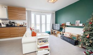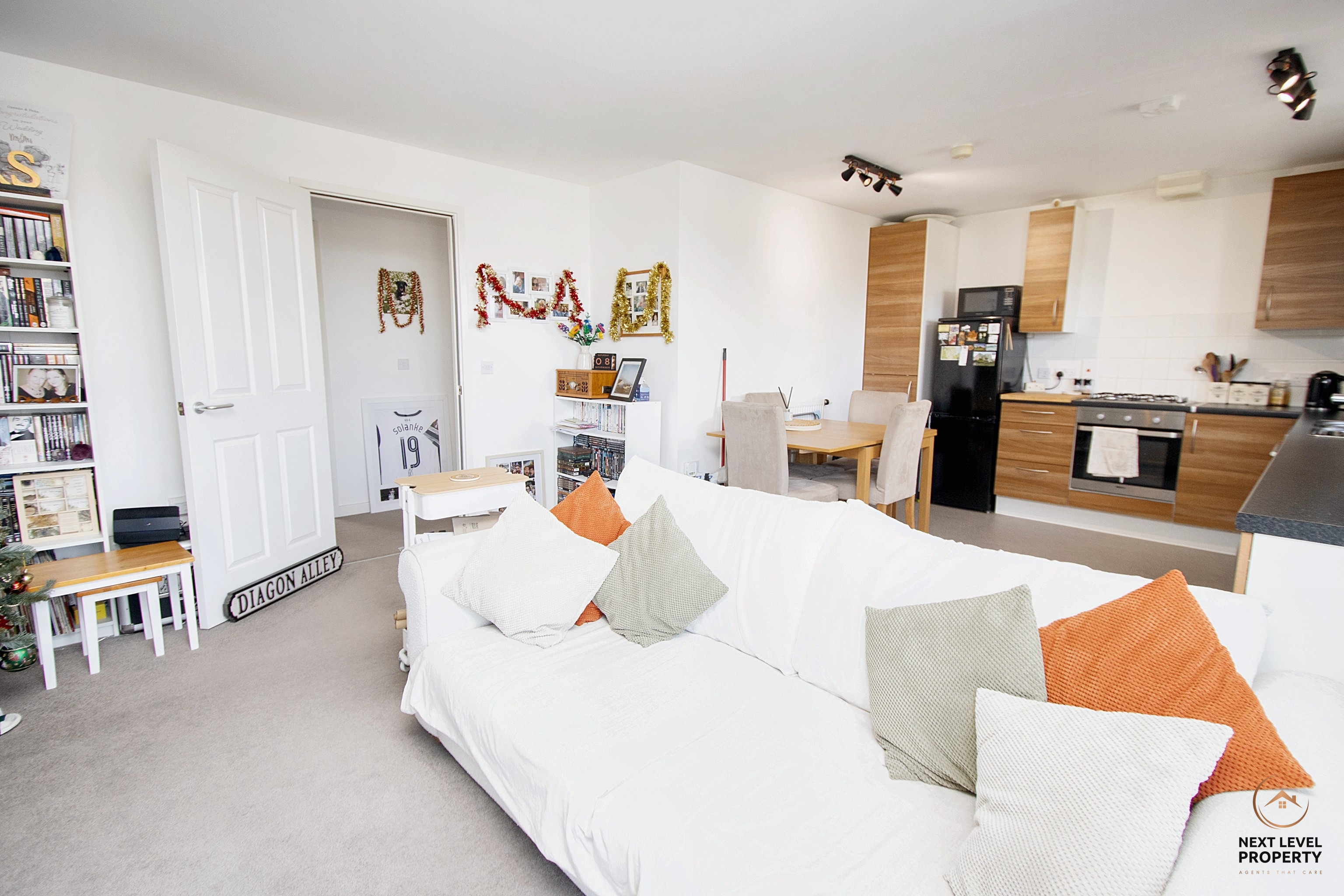 The kitchen area is spacious and thoughtfully laid out, fitted with a stylish range of modern wall and base units. It includes a single electric oven, four-ring gas hob with extractor above, plumbing for both a washing machine and dishwasher, and space for a fridge/freezer. A rear window brings in plenty of natural light. Flowing nicely from the kitchen, the living area offers a wonderful sense of space and features a Juliet balcony with far-reaching views over the surrounding area — the perfect place to enjoy the beautiful sunsets.