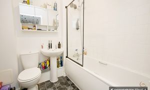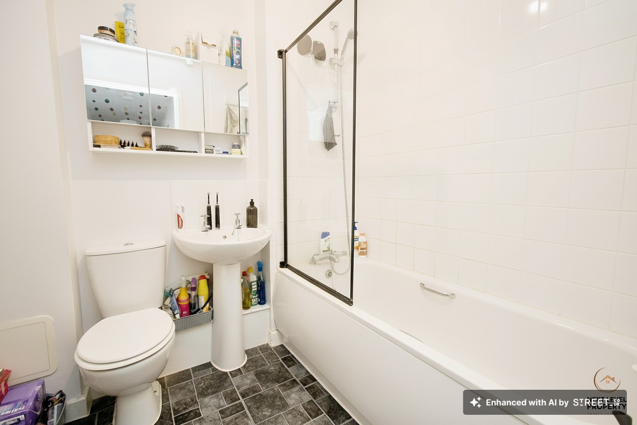 Both bedrooms are generous doubles, offering plenty of space for furniture and flexibility to suit your lifestyle — whether you’d like a guest room, home office, or a peaceful space to unwind. The bathroom is finished in a clean, contemporary style with a modern white suite, including a bath with mixer tap shower, glass screen, WC, and wash basin, complemented by tiled splashbacks and a radiator to keep things cosy.